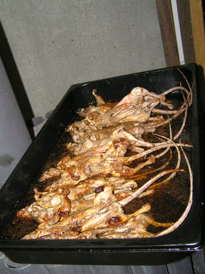 Párkrát jsem (ještě za čerstva, nezamřelou) mraženou mrtvolu před preparací ovářela vcelku, páč jsem byla líná to stahovat a kuchat a ještě, že jsem to vařila venku. Smrdělo to i tak dost, vřele nedoporučuji a už vůbec ne v uzavřených prostorách