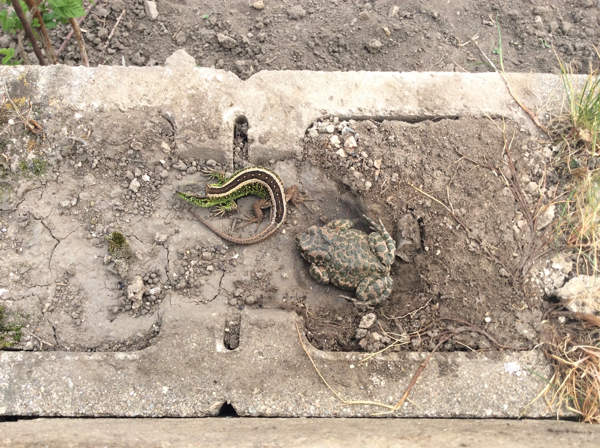 1) Pod jednou dlaždicí (předpokládám, snad správně) ropucha a ještěrka