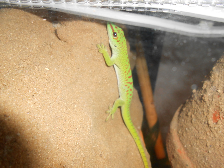 Přesně tak, nevypadá úplně špatně a když se v pořádku svlékl, sílu ještě mít bude. Podle zbarvení je fakt malý, minimálně půl roku ho mějte od samičky. Krmení jak píšou Aurifer a hadilov, pokud bude žrát, tak po 5-7 dnech mu dejte cvrčka nebo dva, raději menší než velké.