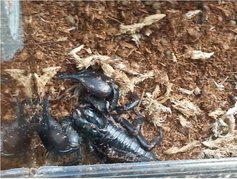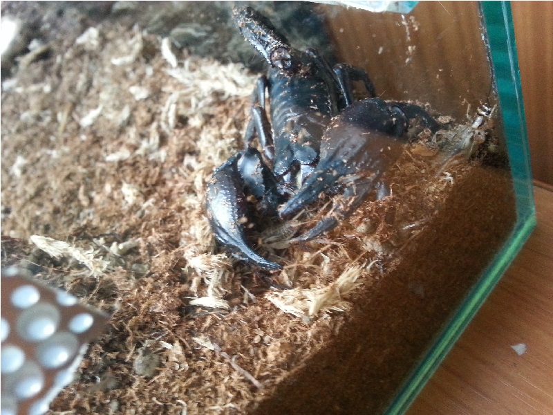 mám jisté zkušenosti s chovem druhu Pandinus imperator. Když jsem byl včera kupovat cvrčky v jednom nejmenovaném zverimexu, všiml jsem si, že mají na prodej veleštíra. Bohužel tam byl ve velmi žalostných podmínkách (ukrutně malé terárium a plesnivá podestýlka), že mi ho bylo líto a nakonec jsem se pro něj vracel, abych mo z těchto podmínek vysvobodil. Na cedulce pod teráriem byl nápis Veleštír císařský, ale popravdě podle vzhledu vypadá spíš jako heterometrus longimanus, nebo heterometrus spinifer. Nemám moc ve zvyku kupovat štíry ve zverimexu a také musím říct, že mě stál víc, než všichni 4 imperátoři co mám doma. Prozatím jsem ho ubytoval v terárku, kam dávám samice s mláďaty. Můžete mi prosím podle fotek napsat, co by to mohlo být za druh, popřípadě, jestli ho mohu dát k ostatním? Děkuji