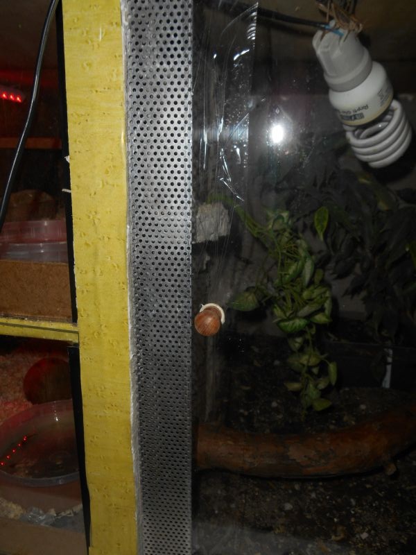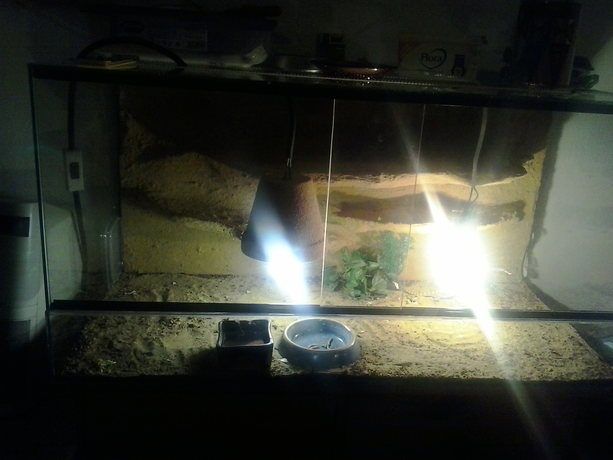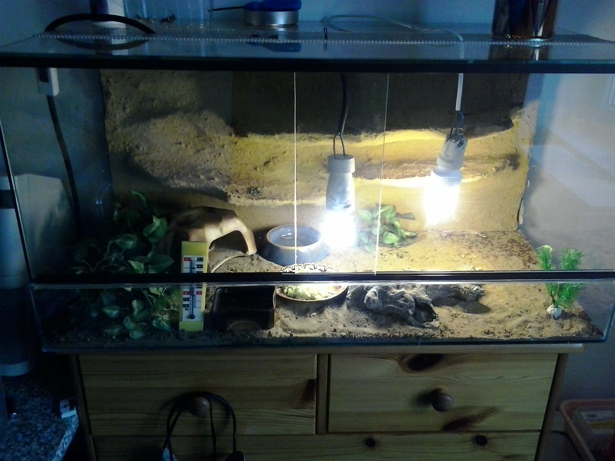 přidal jsem domeček vyhřívací ostrubek a UVB jsem posunul blíže k té 75W a sundal jsem ten květináč děkuji moc a fotak je celkem blby stačí trocha šera a všechno zčerná zíra přes den sem dám viditelnou fotku:)