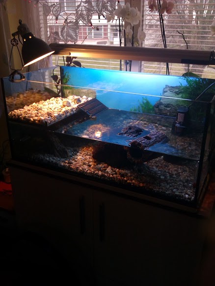 Velmi krásné a luxusní akva, gratuluji. Jen doporučuji přemístění do jiného místa v pokoji - nedopadá sluneční svit, je tam průvan, může se akva rozbít při otevření okna, okno praští, želva se lekne.