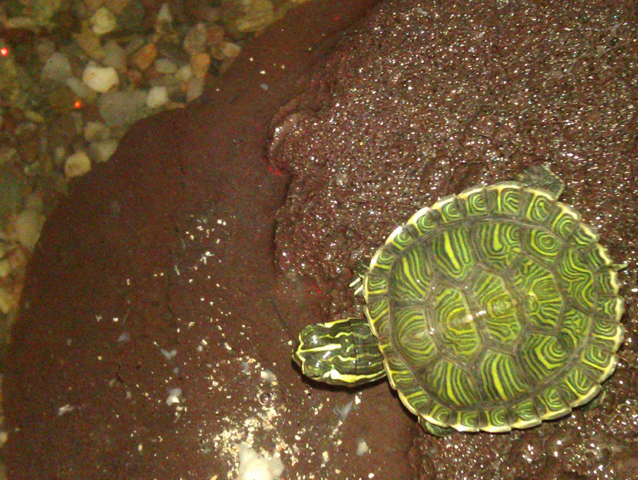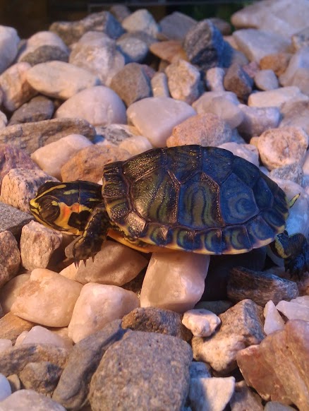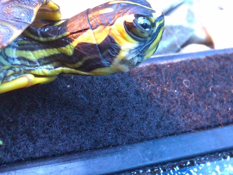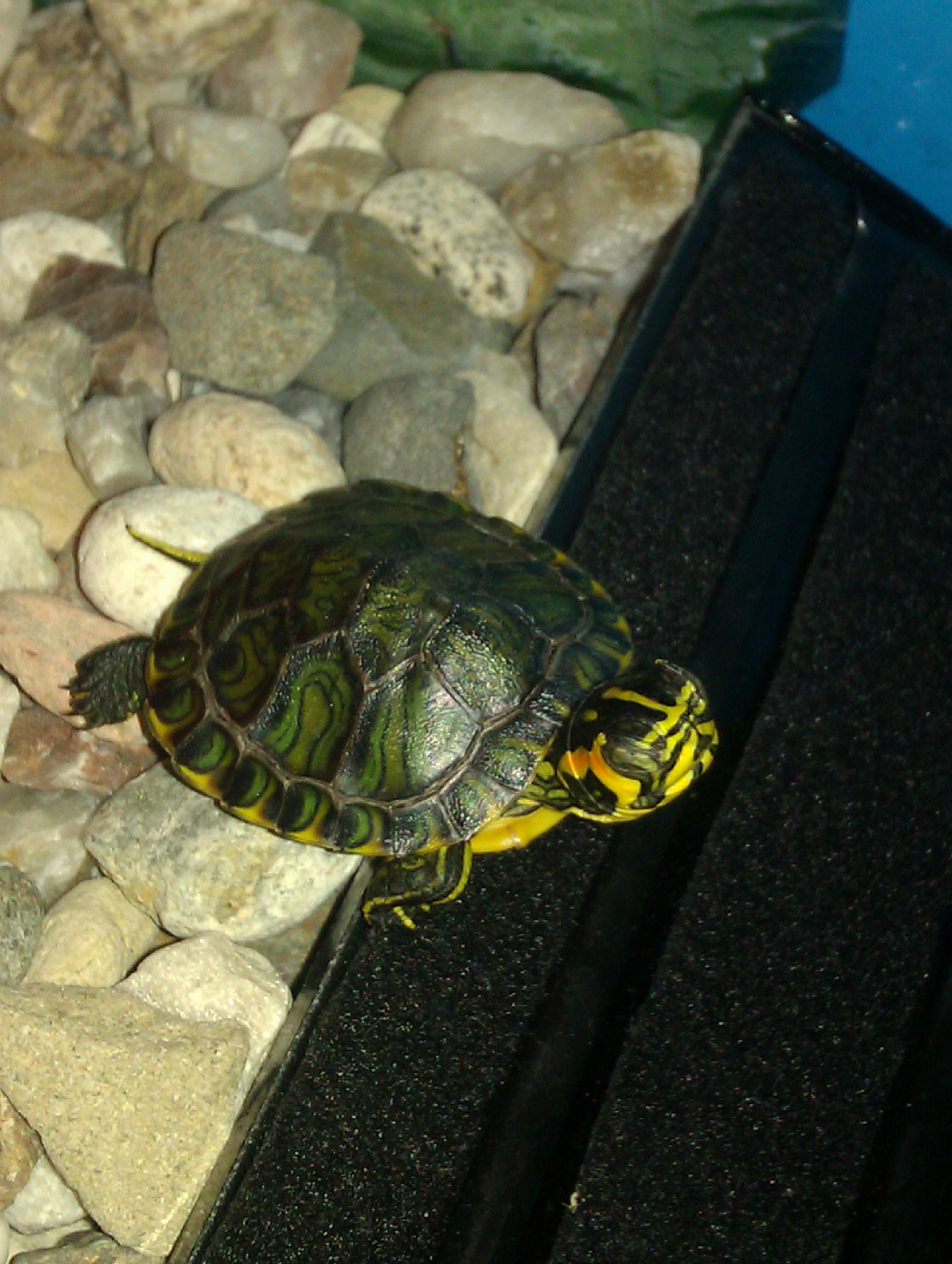 Tak ta menší želvička nám přibrala za týden jeden gram-9gramu.Žere víc,ale od té doby co jí máme má problémy s potápěním.Potopí se ke dnu a hned jí ten krunýř táhne nahoru.Pod vodou plave rovně a dýchá normálně.Celkově se zlepšila-je více živá.I během dne si sleze do vody,to ze začátku nedělala.