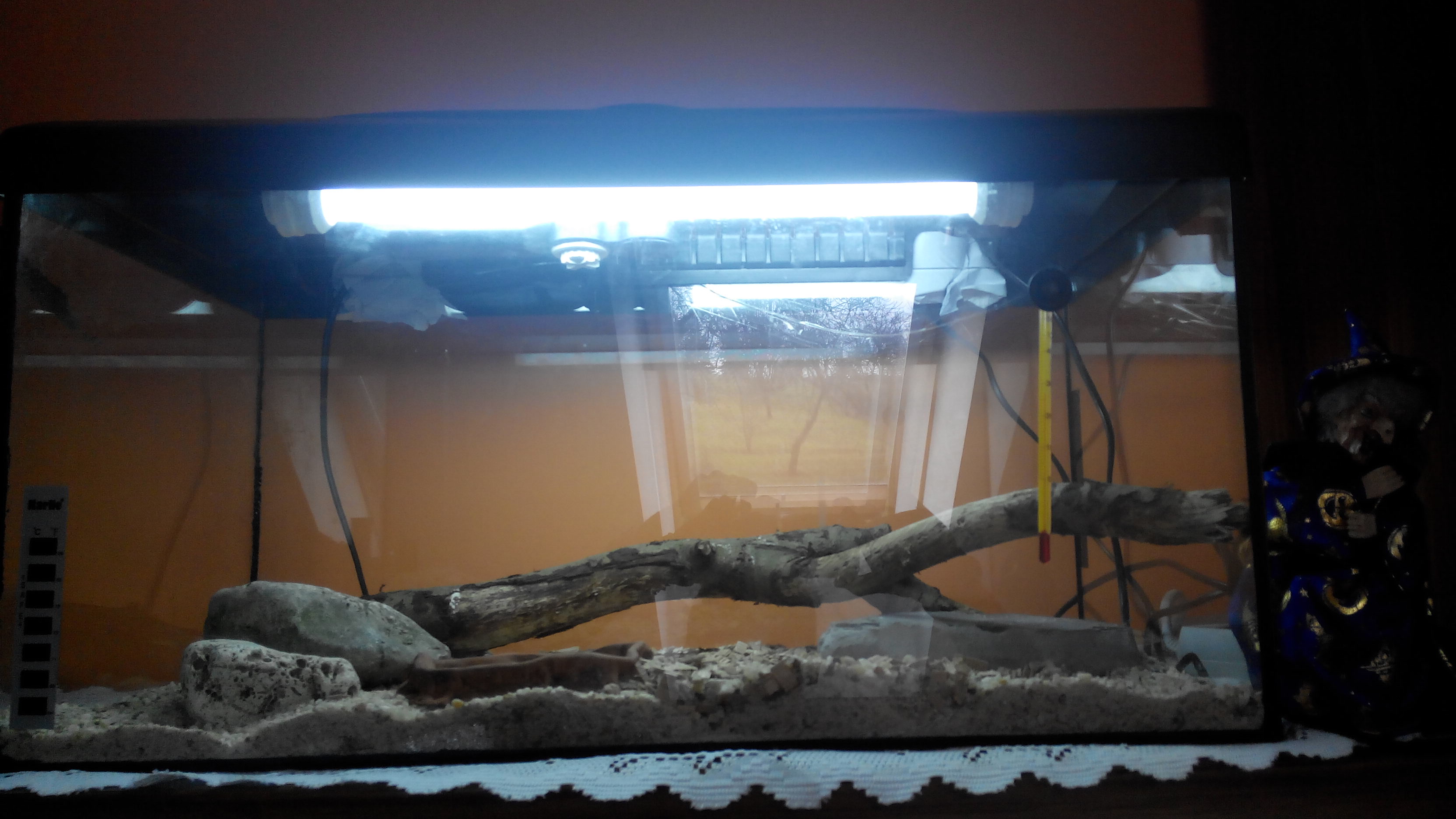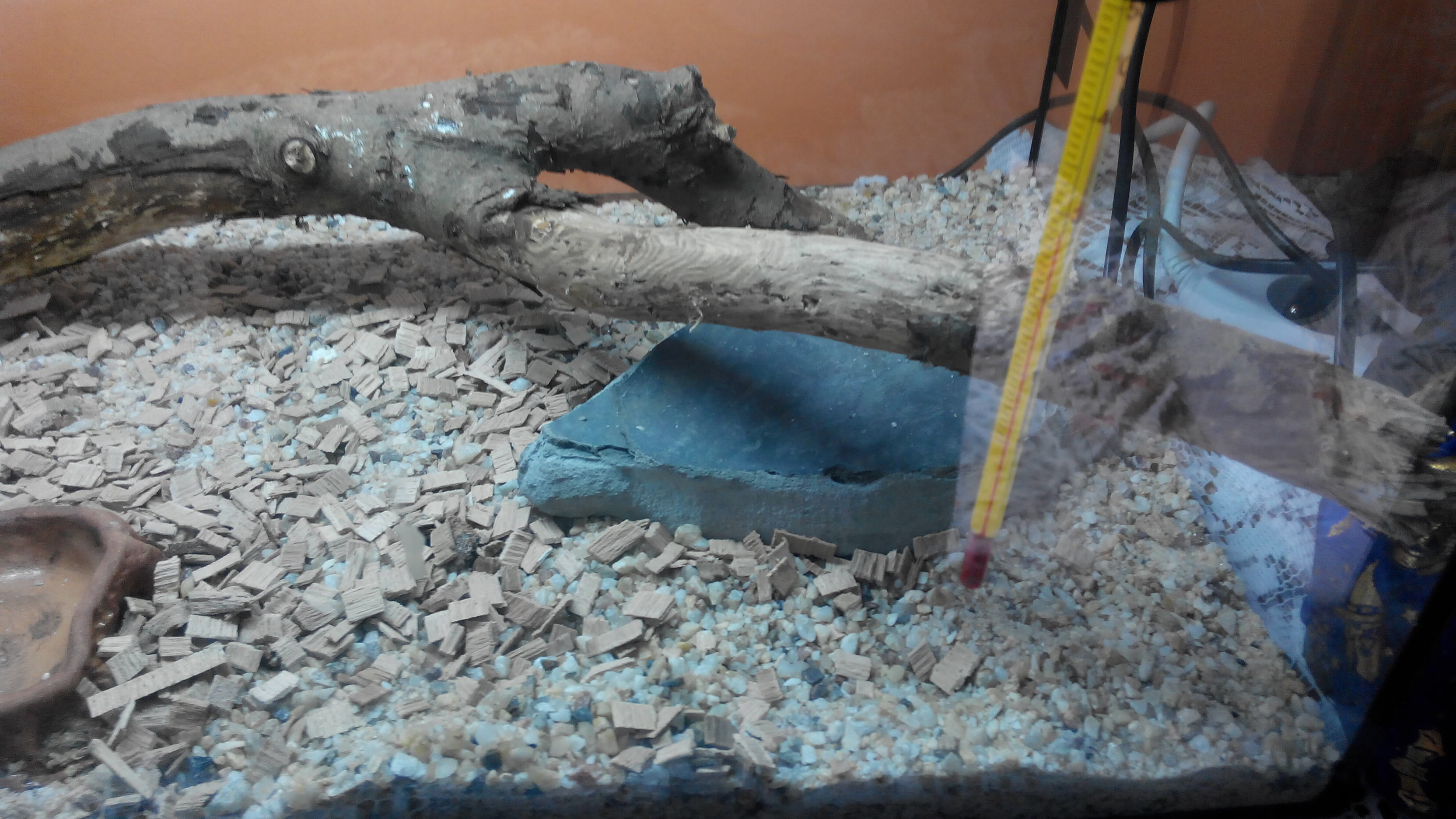 Ten kámen je výhřevnej? Nebo čím tam topíte? A miska na vodu je prázdná, už ji tam má? Je tam aspon na stropě dostatečné větrání?(neznam tento typ akvária)