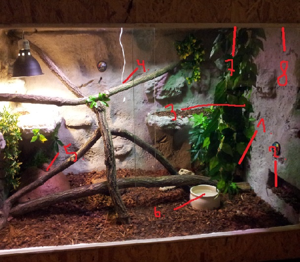 zde je stručné foto 1.ventilace,2. ventilace(zavřená),3.místo kde had odpočívá,4.čidlo na teplotu a vlhkost,5.úkryt pro hada kam ovšem zatim neleze,6.miska na vodu,7.ventilace(zavřená),8.ventilace,technika-top ný kámen 10W, žárovka40W, 2 zářivky součet 26W,terá.rozměry- 125-80-80cm, postaveno z ošetrřených OSB desek 12mm,stěna z polistyrénu natřená fasádním lepidlem. ventilaci jsem zavíral takto,abych vyzkoušel vliv na teplo a vlhkost čistě test.teplotu a vlhkost měřím pomocí 3 teploměru každý v jiné tepelné zoně a 2 vlhkoměrů mechanickýho a digitálního.Rosil pouze 1dnou 4dny nerosím.topný kámen jede přes noc,v tera umělé květy a ošetřené větve z přírody umyté převařené a namočené v hypermanganu draselným poté vysušené a v montované.had není import