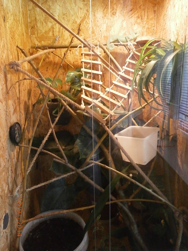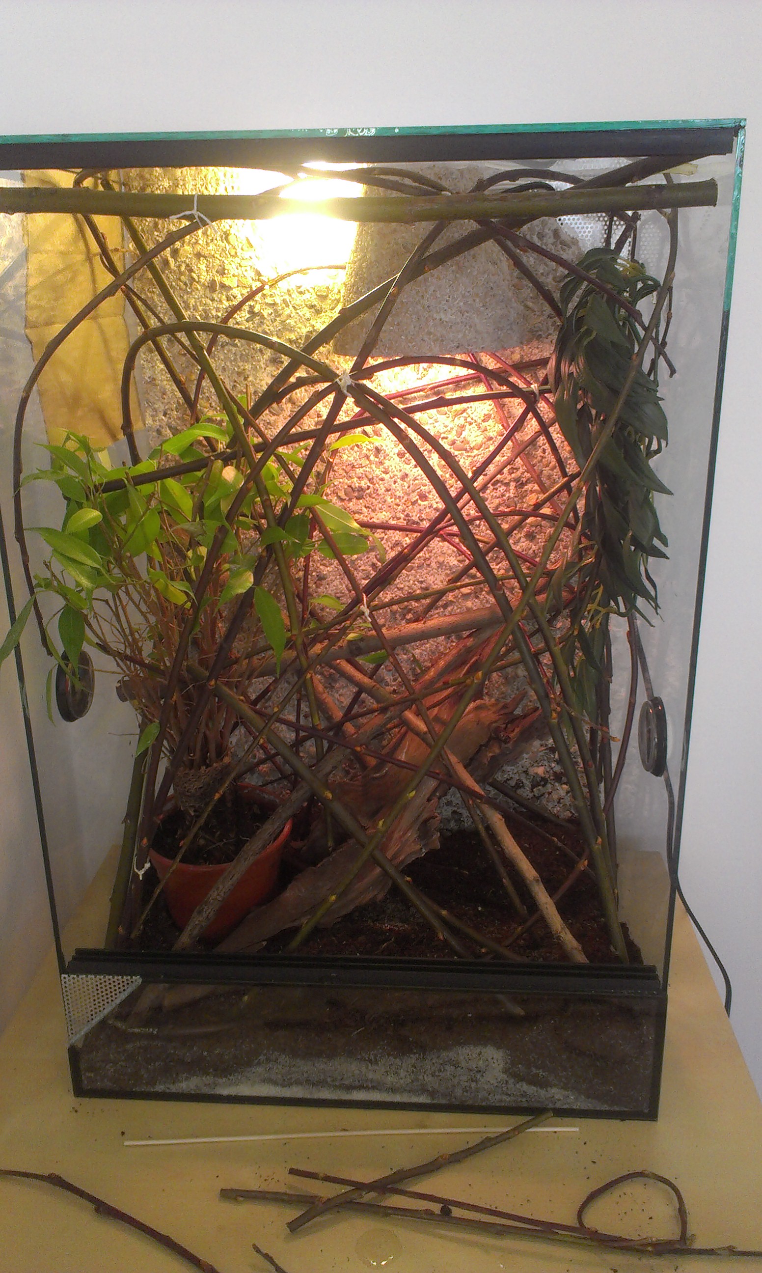 Musíte tam připravit pořádnou prolézačku. Co nejvíce větví. Představte sim, že tam bude chameleon zavřenej x let. Takže by Vás asi taky moc nebavilo lozit pořád dokola na té samé větvi. Co nejvíce větví a co nejvíce proplést. A dle mého názoru jsou nejlepší vrbové větve. Neříkám, že se máte řídit podle tohohle obrázku, ale aspoň takto.