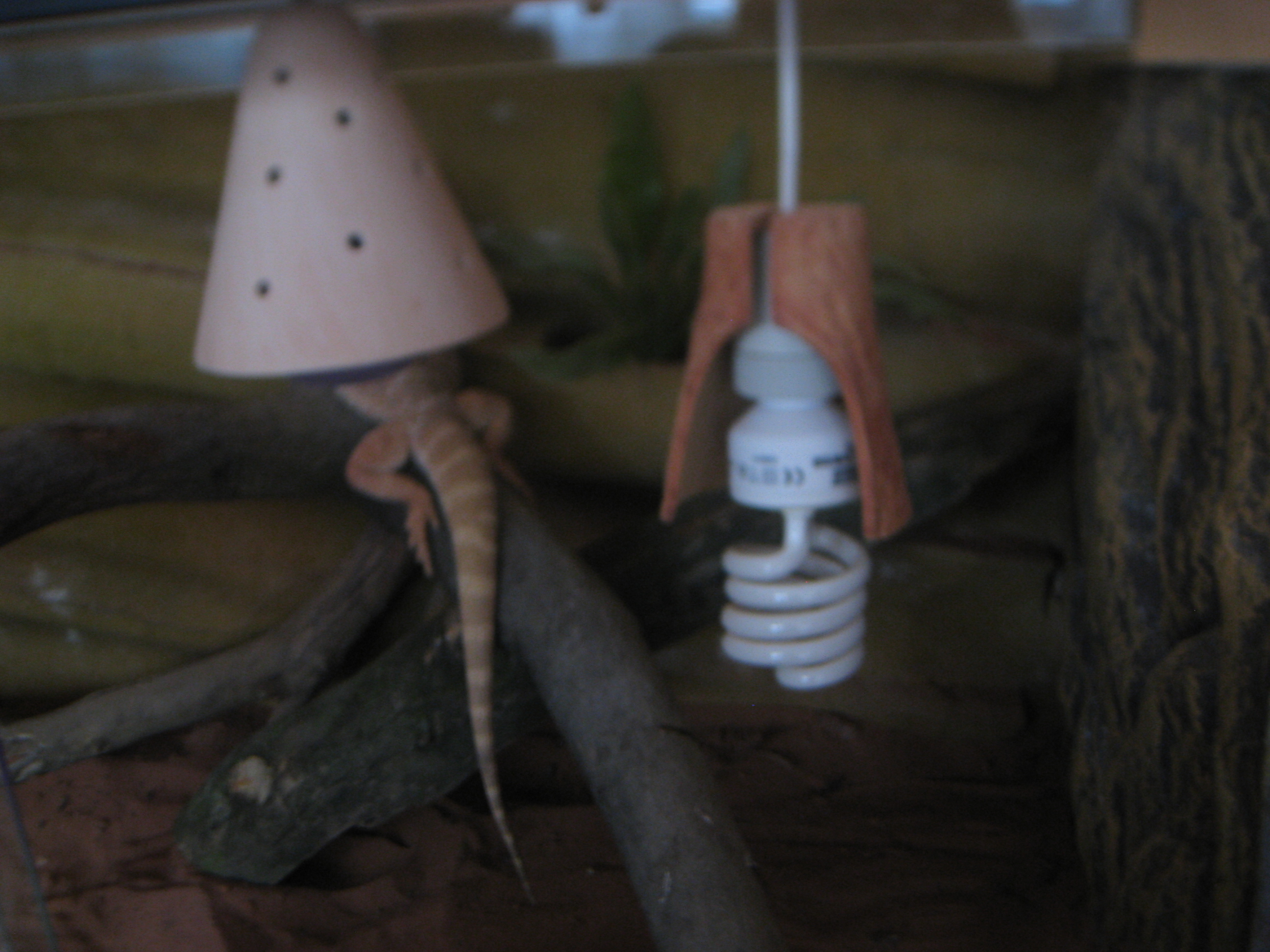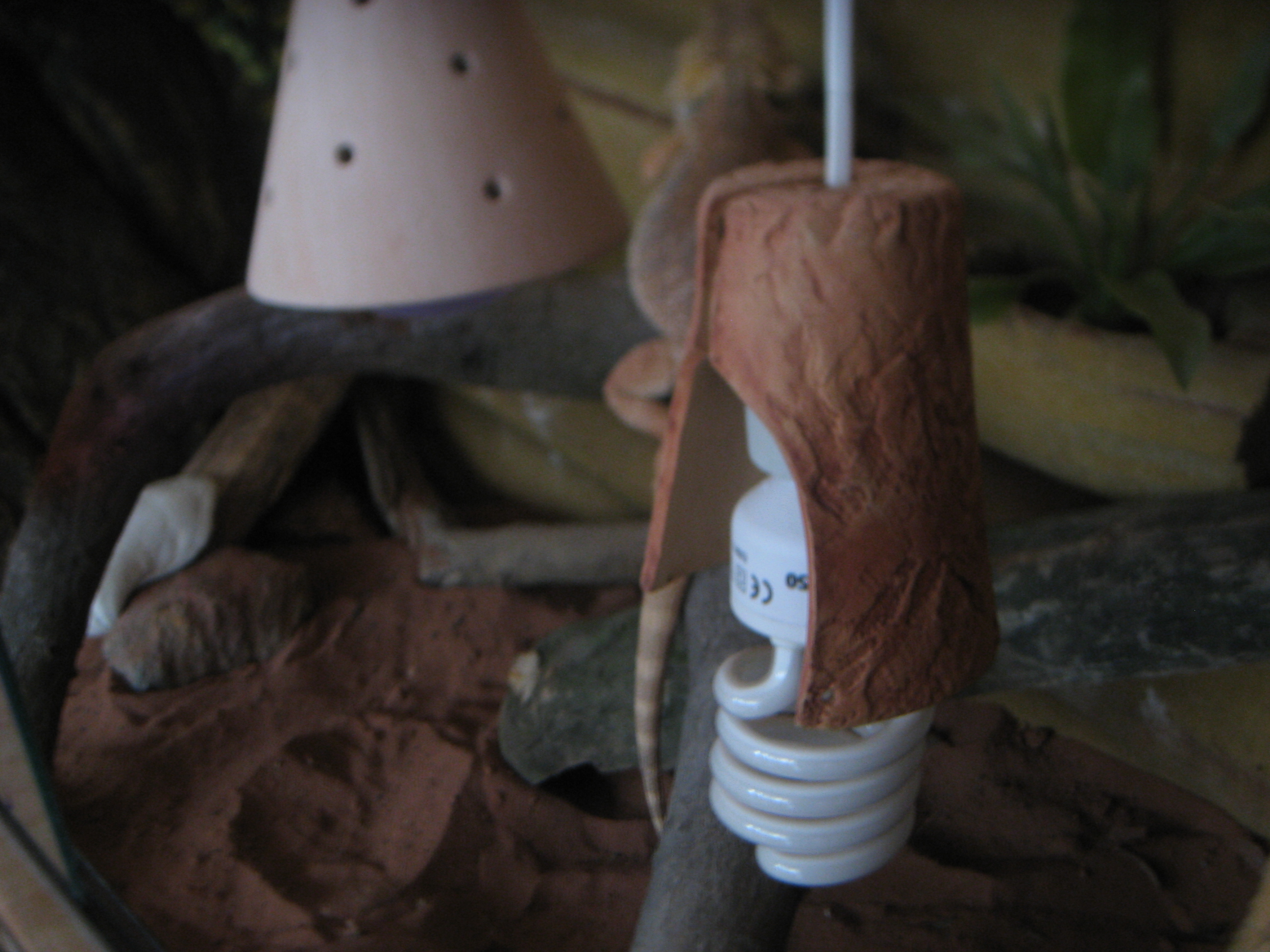 Máme v něm větve,které jsme si sehnali v lese,jsou upravené.Žárovky: topná- Žárovka EXO TERRA Daytime Heat - 80W,UV-Zářivka Reptile UVB 150 25 W kompaktní - Hagen