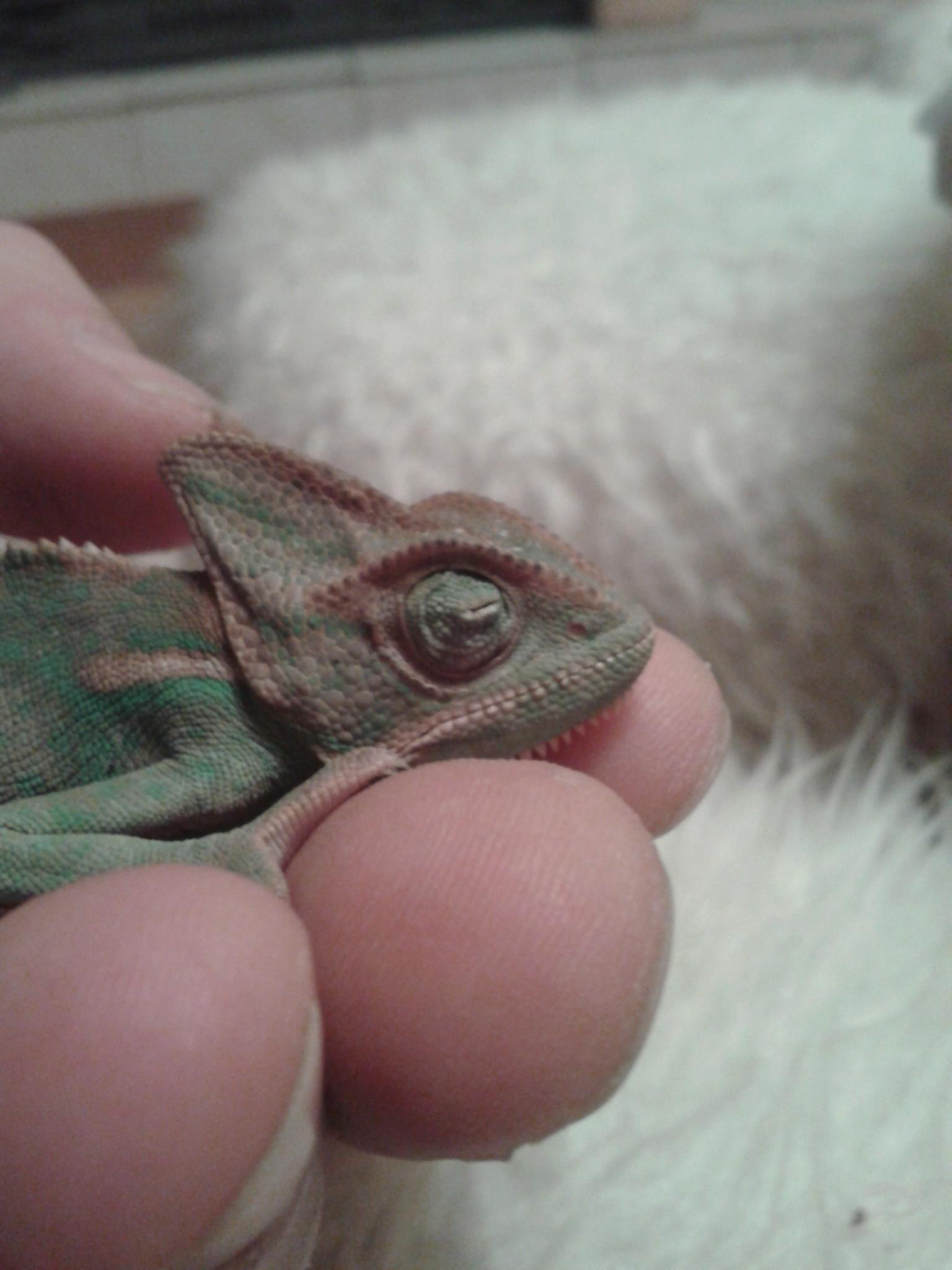 Ahojte, včera som si domov priniesla chameleóna jemenského od švagra, má ale problém a to ten, že zo dňa na deň prestal otvárať oči. Lezie veľmi aktívne, je aj pekne sfarbený, včera sa mi zdalo, že si aj cvrčka chytil (videla som že niečo prežúva, možno to bola len náhoda) chcela by som mu pomôcť len neviem ako, pozerala som aj v knižke o chameleónoch, ale o problémoch s očami nič nepíšu. Nestretli ste sa s tým niekto? Jeden známi mi hovoril, že mám kúpiť optalmoseptonex a potierať mu to tým, ale chcela by som vedieť aj Váš názor,nechcem mu tým ublížiť. Prikladám chamíkovu fotku. Ďakujem