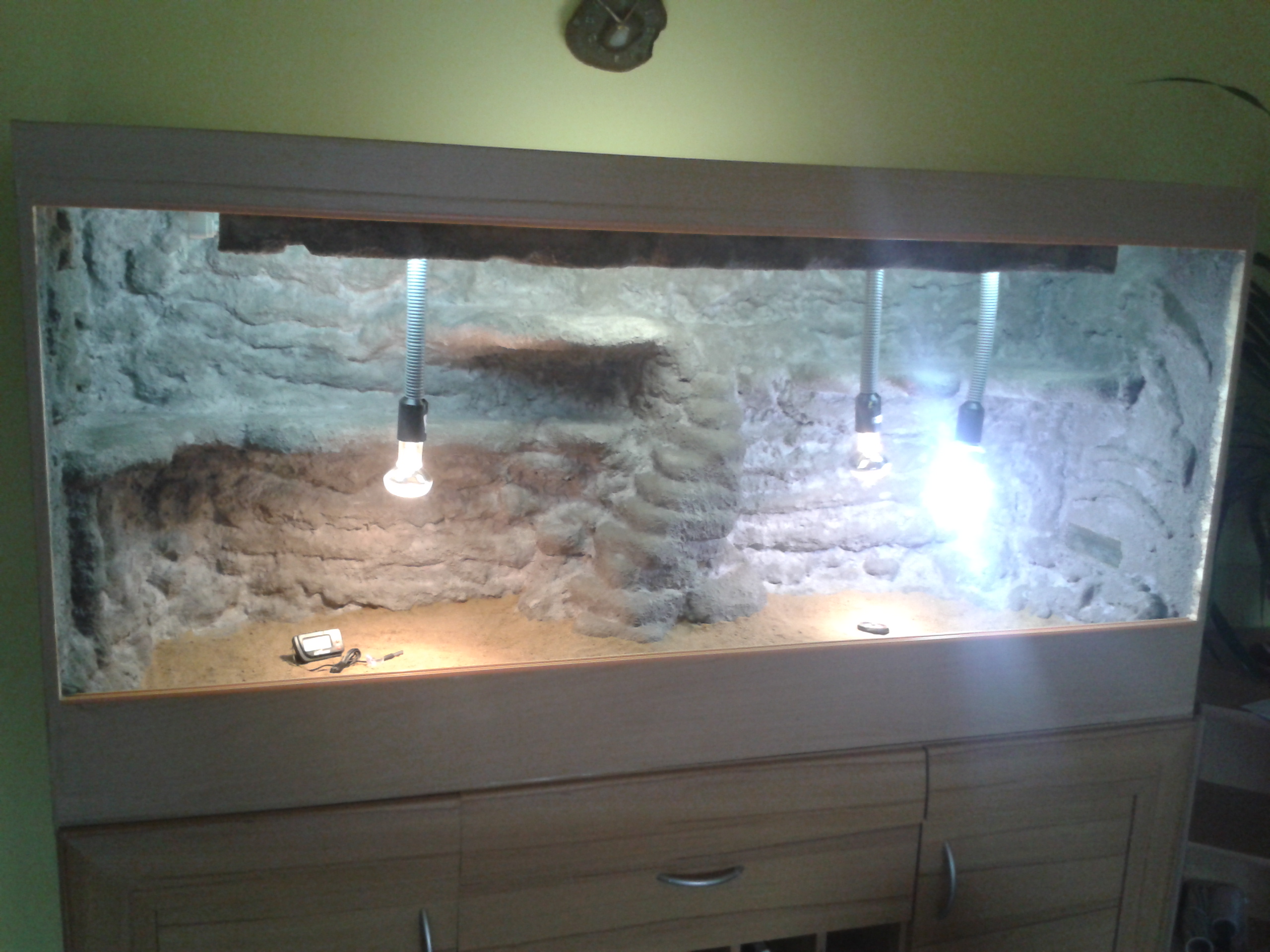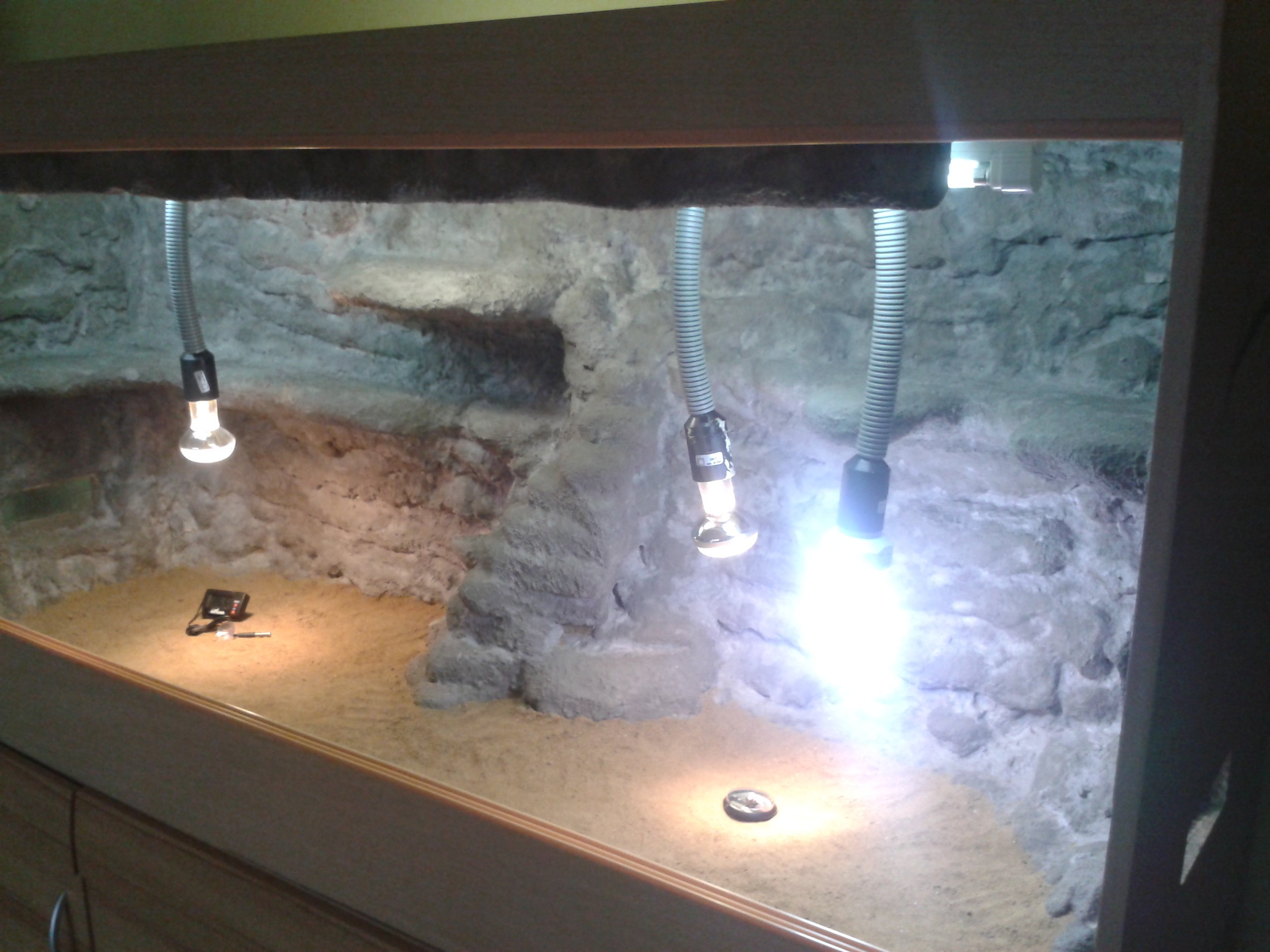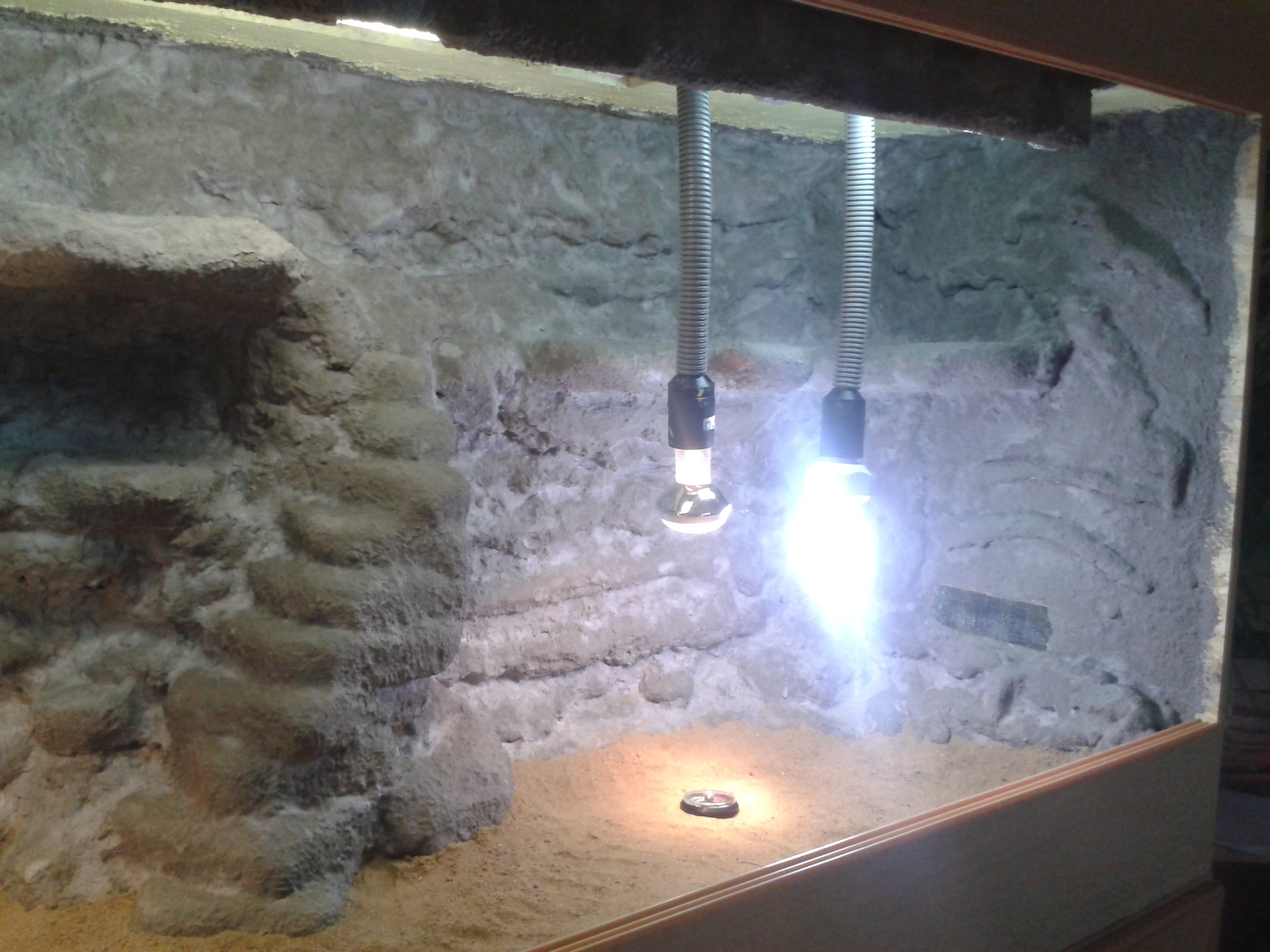 Předpokládám, že pozadí je polystyren obalený lepidlem atd. Husí krky bych obalil stejně a bude po problému. Na kvěináč bych se vyprdl. Vzor krásy to neni taky, spíš naopak, a ještě to spíše uškodí životností zářivky. Ty žárovky by ještě mohly jít přikrýt nějakým spešl krytem co se prodává přímo pro to. Ale ten UVB kompakt do květináče určitě necpat. Ten má svítit, ne být stíněnej... Jinak asi není co vytknout. Dobrá práce! ;-)