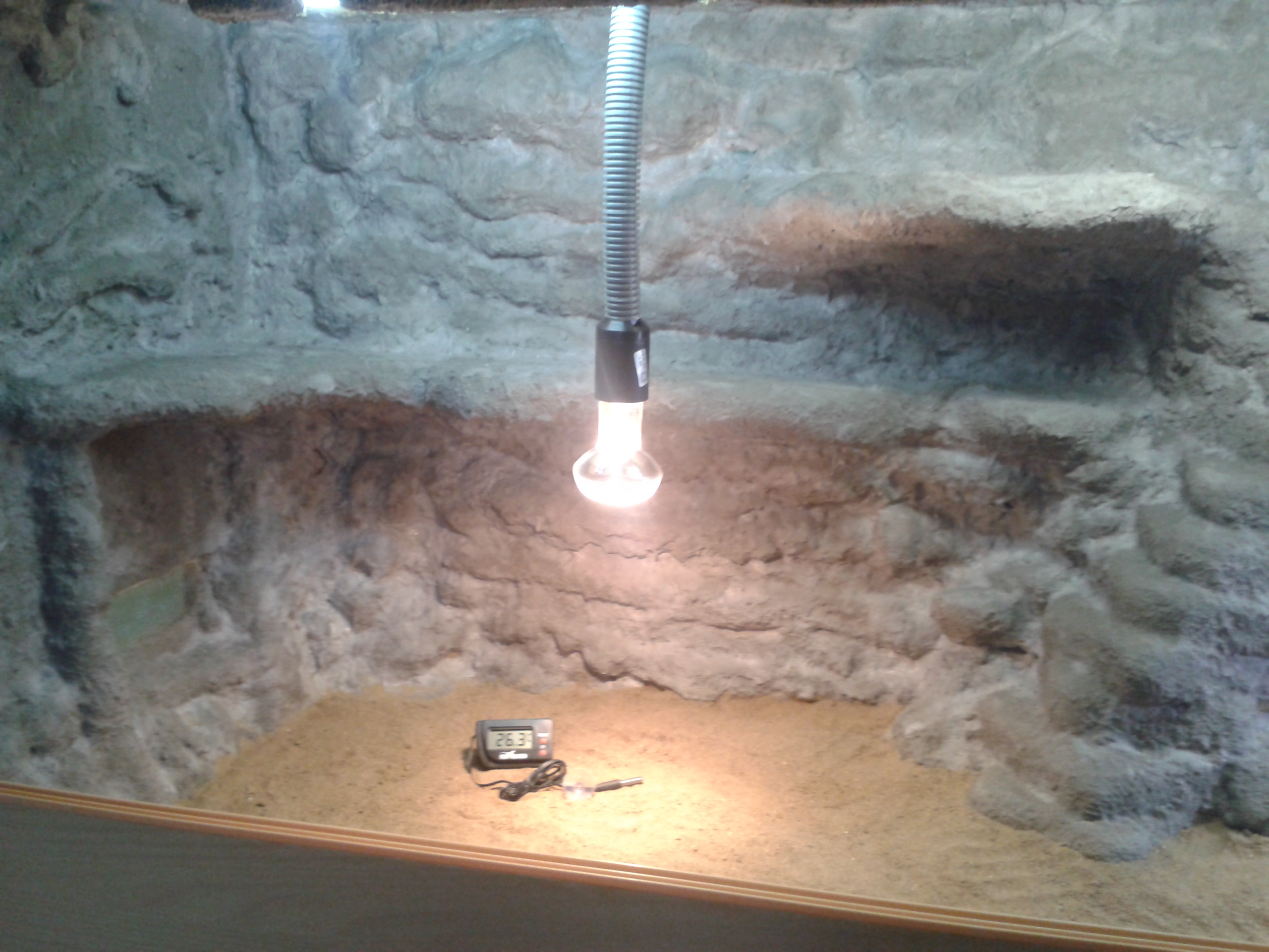 Postavil jsem si nové terárium pro agamu vousatou o rozměrech 150d x 70v x 50h, jako osvětlení jsem použil klasickou zářivku, pro vytápění mám dvě reflektorové žárovky a jako UVB mám Desert Pro Compact 10.0 23W (trixie, reptiland).