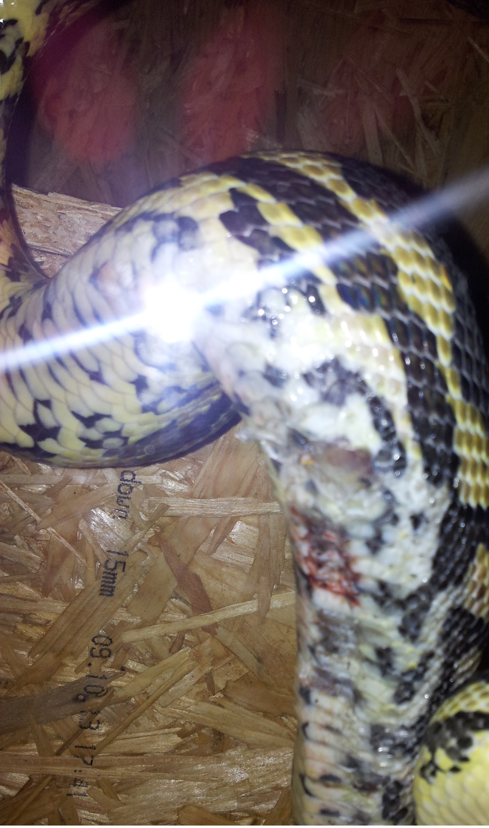 Hada dát na papírové ubrousky a nejlíp ho ještě přesunout do nějakého boxu, ve kterém by nebyly ani větve, aby se to zvíře zbytečně neplazilo po "ostrém" a zbytečně si to neškrábalo. Potom bych začal koupat v řepíku. Koupí se normálně v lékárně. Pak prostě počkat na svlek. Po svleku když se to nebude lepšit, tak asi k veterináři a antibiotika.