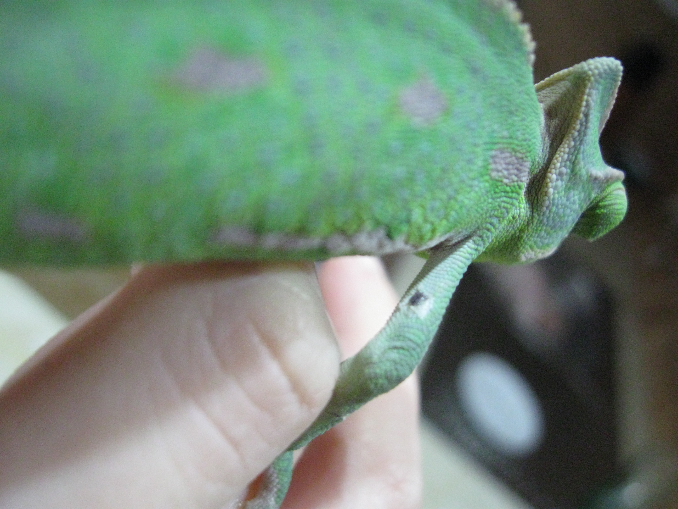 Chtěla bych se zeptat, chameleon má na tváři černé skvrny a pod okem. Je možné že by to měl modřinu? Bojí se nás, je pořád na zemi a nejí.