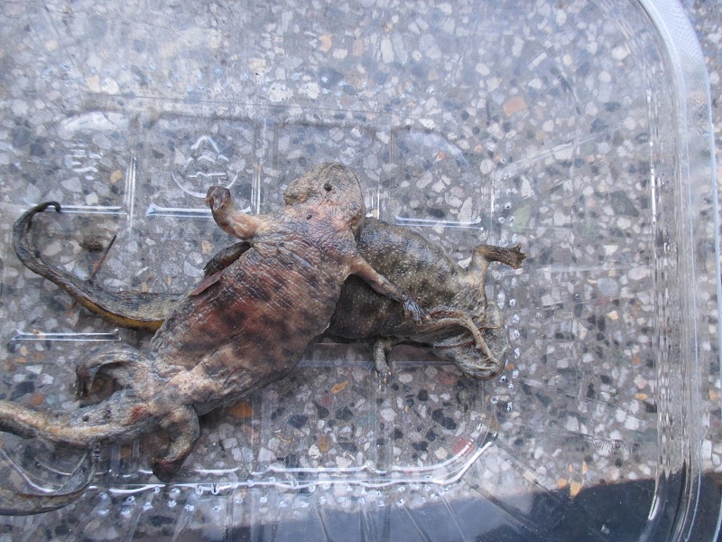 Dodávám foto mrtvolek. Omlouvám se za kvalitu, ale už fakt docela táhnou a já na to mám slabý žaludek :-) U jednoho je zarudnutí břicha patrné ještě teď, nicméně včera (při pokojové teplotě po vylovení z akva) bylo břicho rudé úplně celé. V noci na dnešek byli při venkovní teplotě. U druhého zarudnutí na fotce vidět není, ale zdá se mi, že na jednom boku je začervenalý taky.