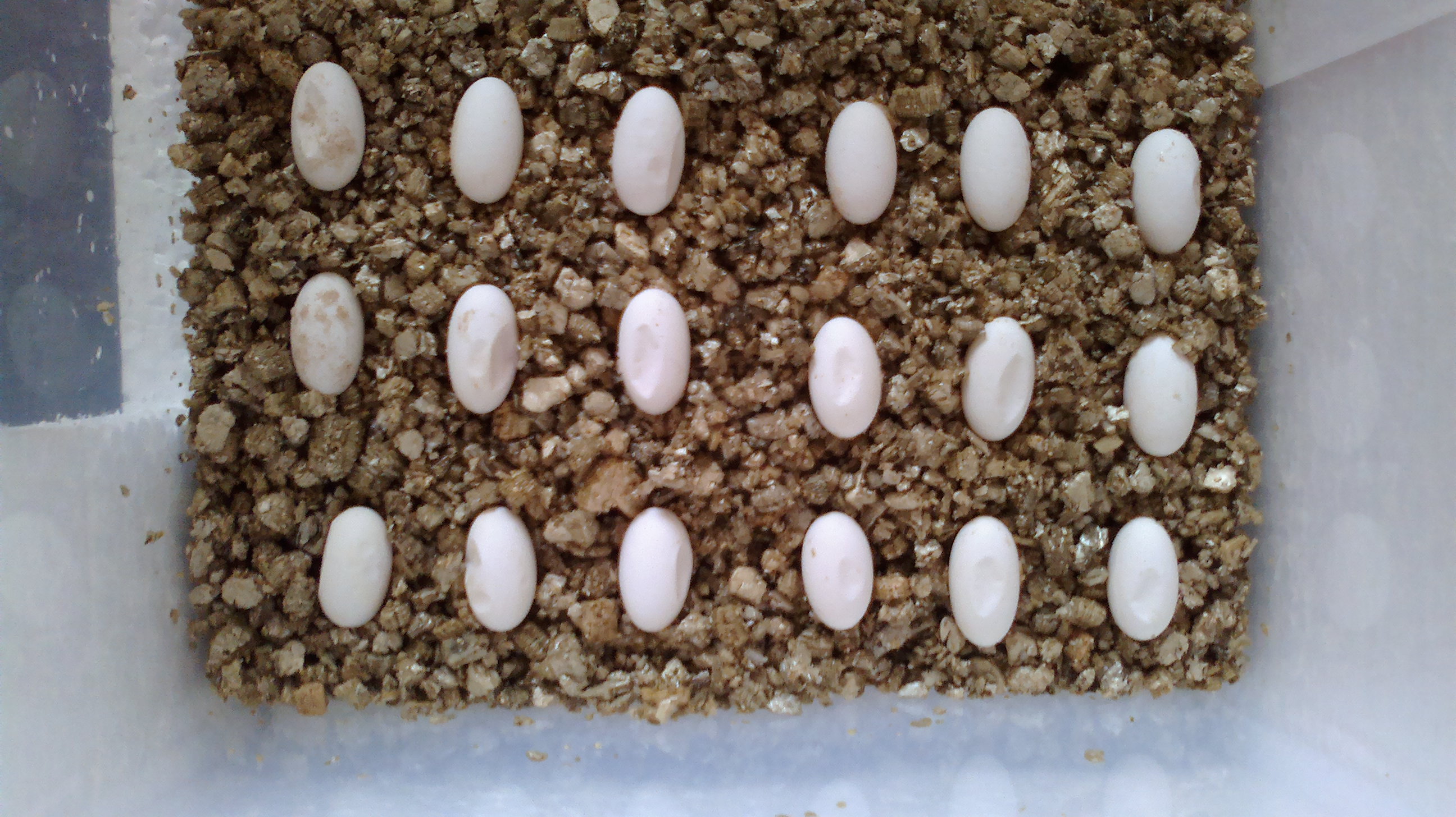 Jelikož čekám od svojí samice první snůšku až za týden, tak jsem kvůli téhle nečekané včera vyrobila narychlo inkubátor a vajíčka jsou v něm od včera v teplotě 28 stupňů a vlhkost 86%. Všechna vajíčka vypadala po nakladení pěkně a teď vypadají takhle. Když jsou od tak mladé, tak nečekám že z toho něco bude, tak se jen chci ujistit, že pokud se budou i nadále propadat, tak je mám spíš vyhodit než jim zbytečně topit a čekat? Našla jsem jen, že špatná vajíčka už po nakladení vypadají špatně, žlutá, apod., je to moje první snůška, tak to ještě nepoznám.