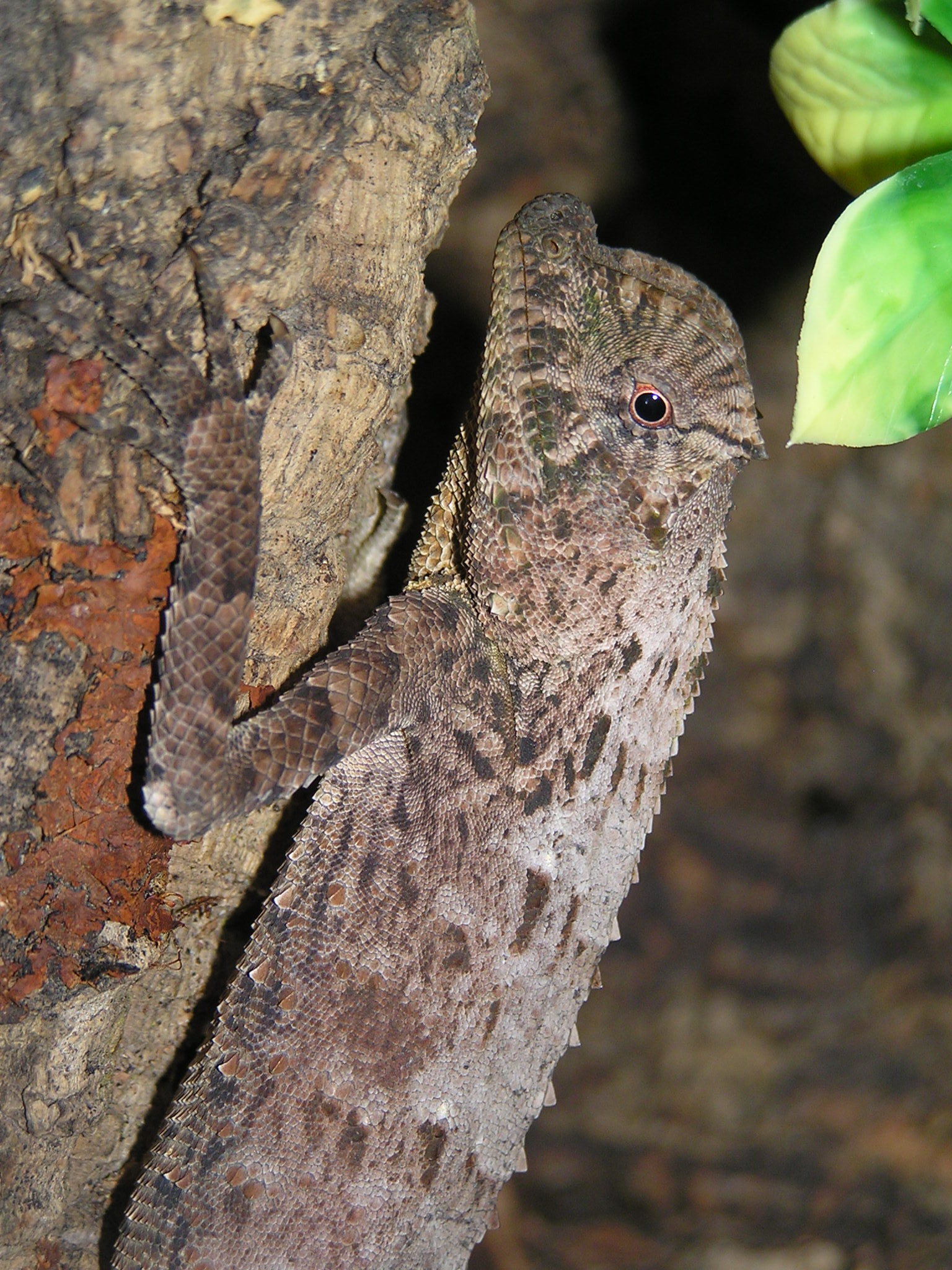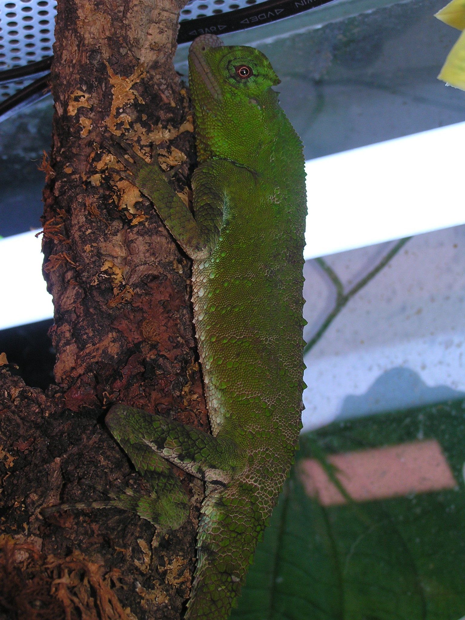 Co se týče nároků, tak chov je srovnatelný s ostatníma asijskýma pralesníma agamama. Větší ubikace (třeba 90x50x90 pro 1,1) orientovaná na výšku, vybavená silnějšími větvemi a kmínky orientovanými spíše svisle, hodně rostlin, tekoucí voda. Na dno rašelina s pískem, drcená kůra, hrabanka atd. Zdroj UV (stačí lineární trubice, ale nějaký mít musí), případně i lokální zdroj (ale vyhřívat se jsem je nikdy neviděla). Teplota záleží na oblasti, odkud jsou, protože jsou 2 formy- větší horská (která potřebuje o něco chladněji) a menší nížinná, která potřebuje tepleji. Ta nížinná forma už možná ale je jiný druh. JInak teplota přez den mezi 22-26°C, u nížinné formy max. 30°C, v noci min. 20°C, horská potřebuje chladněji a určité noční poklesy, cca na 18°C. Krmení není problém, žerou z pinzety saranče, cvrčky, zofobase...ale volně puštěné cvrčy většinou neradi loví. Jsou hodně citliví na stres, takže se do nich zásadně nevrtat, nerušit. Co se týče odchovu, tak se v lidské péči občas množí, stejně jako ostatní podobné agamy. ale samičky rády zadržují snůšky a pokud už se to povede, tak mláďata není uplně jednoduché udržet...to je v kostce asi tak všechno.