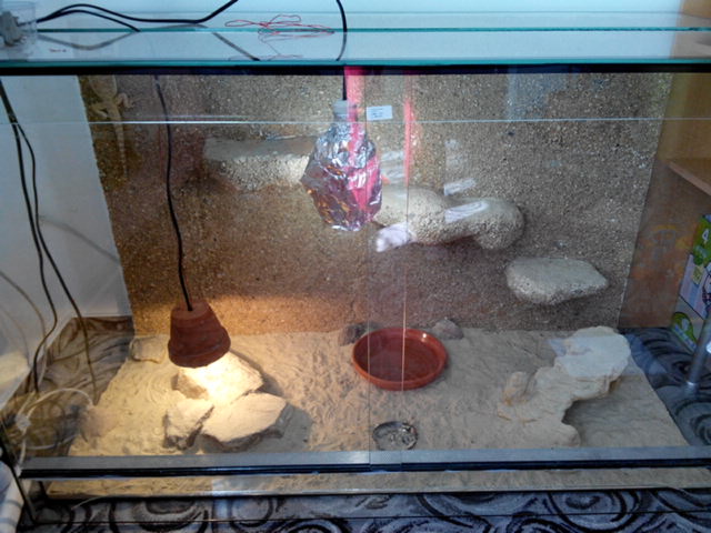 Terarium - spatne osvetlene, zdroj UV nejaky kompakt nahore, vyhrevne misto dole, zadny jiny zdroj svetla, pochybuju ze v terariu bude spravna teplota. Ta zarovka je podivne hrozne nizko, je to bodovka? Chce to pridat nahoru cim silnejsi zarivku na prosvetleni prostoru, osobne bych asi zakryl ty bocni steny - neni nutne, ale mam pocit ze jsou tak klidnejsi, min stresovane. Jinak terarko mi prijde dost velke na to aby tam sla dat nejaka vybojka.