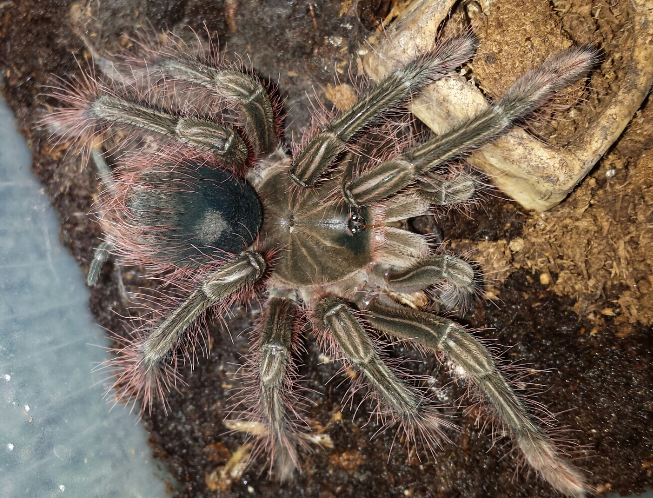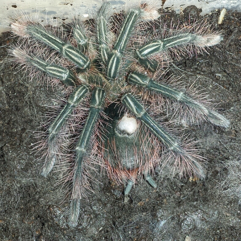 Měli jsme subadultní samici T. strimi, po prvním svleku u nás (v druhé polovině listopadu) se jí na zadku udělala boule (první foto). Nebylo to otevřené a zvíře bylo ok. Aktivní a žravá. Po druhém svleku, který proběhl tento čtvrtek jsme jí bohužel museli utratit. Boule se otevřela a při každém pohybu z ní dost tekla hemolymfa + měla vyhřezlý kousek vnitřností (viz. další foto).