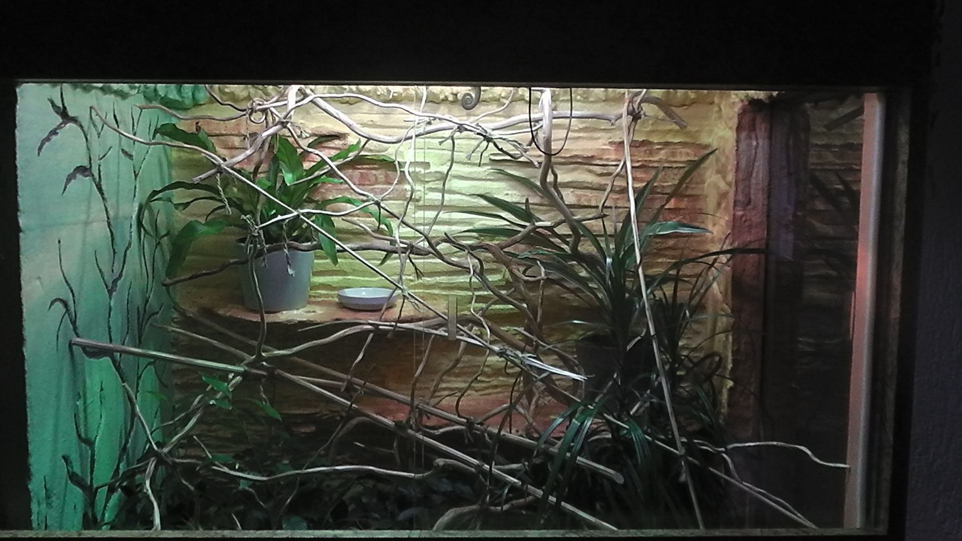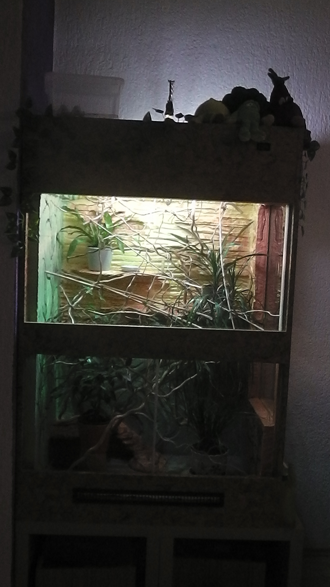 Bohužel máme celý barák tmavý tak to tak působí, jinak tam má světla jako v tropický azurový den. Spodek terária tak může připadat, protože tam má rostliny, ale dolů chodí pouze pít na listy, jinak se zdržuje pouze nahoře u sluníčka.