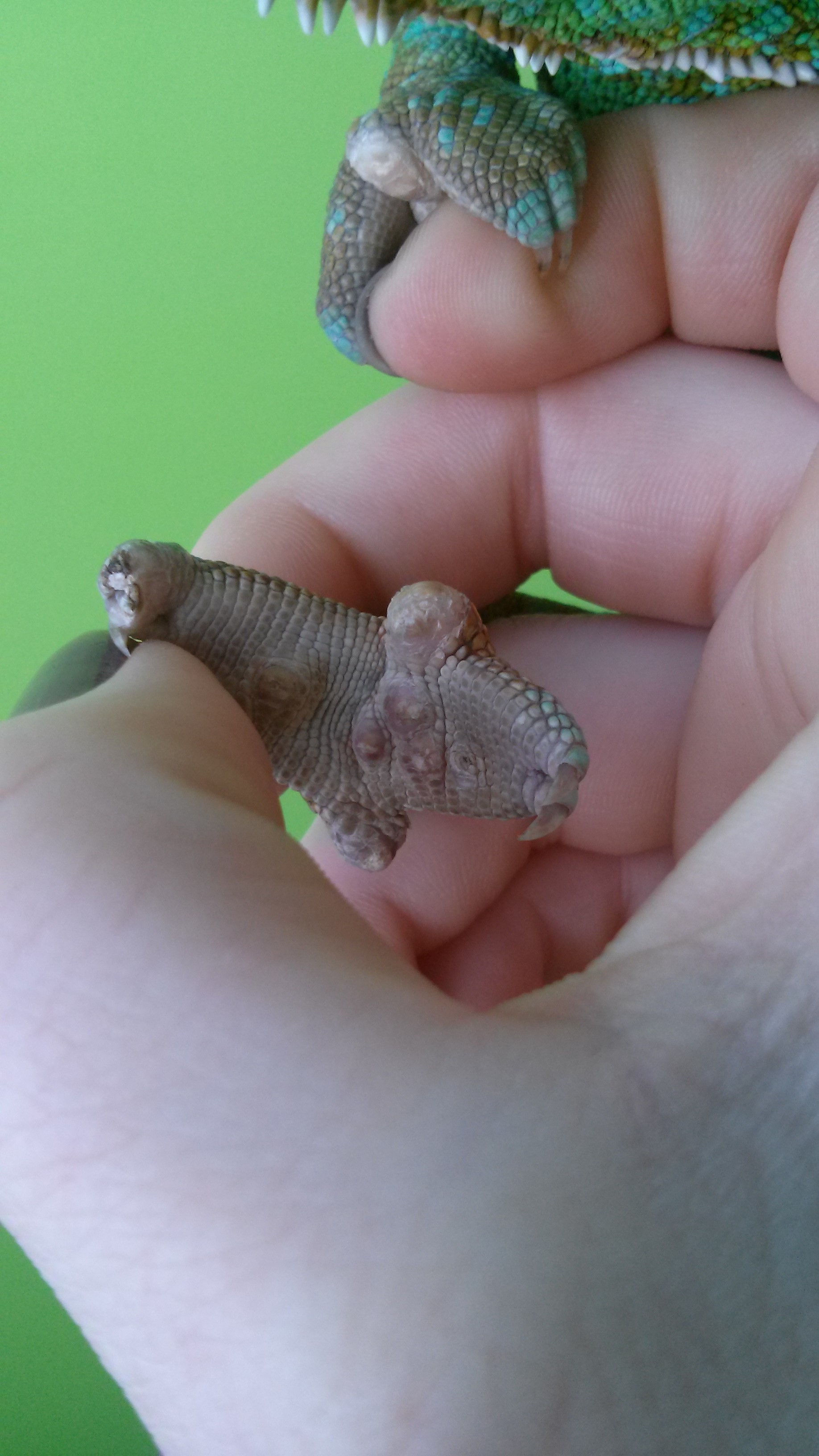 Ahoj, prosím o radu.. Mám 2 roky starého samce chameleona jemenského, a před několika týdny se mu na všech tlapkách udělaly něco jako mozoly. Co s tím mám dělat? Krmím sarančaty obalenými v Nutri Mixu pro plazy, svítím obyčejnou i UVB žárovkou. Díky za radu :)