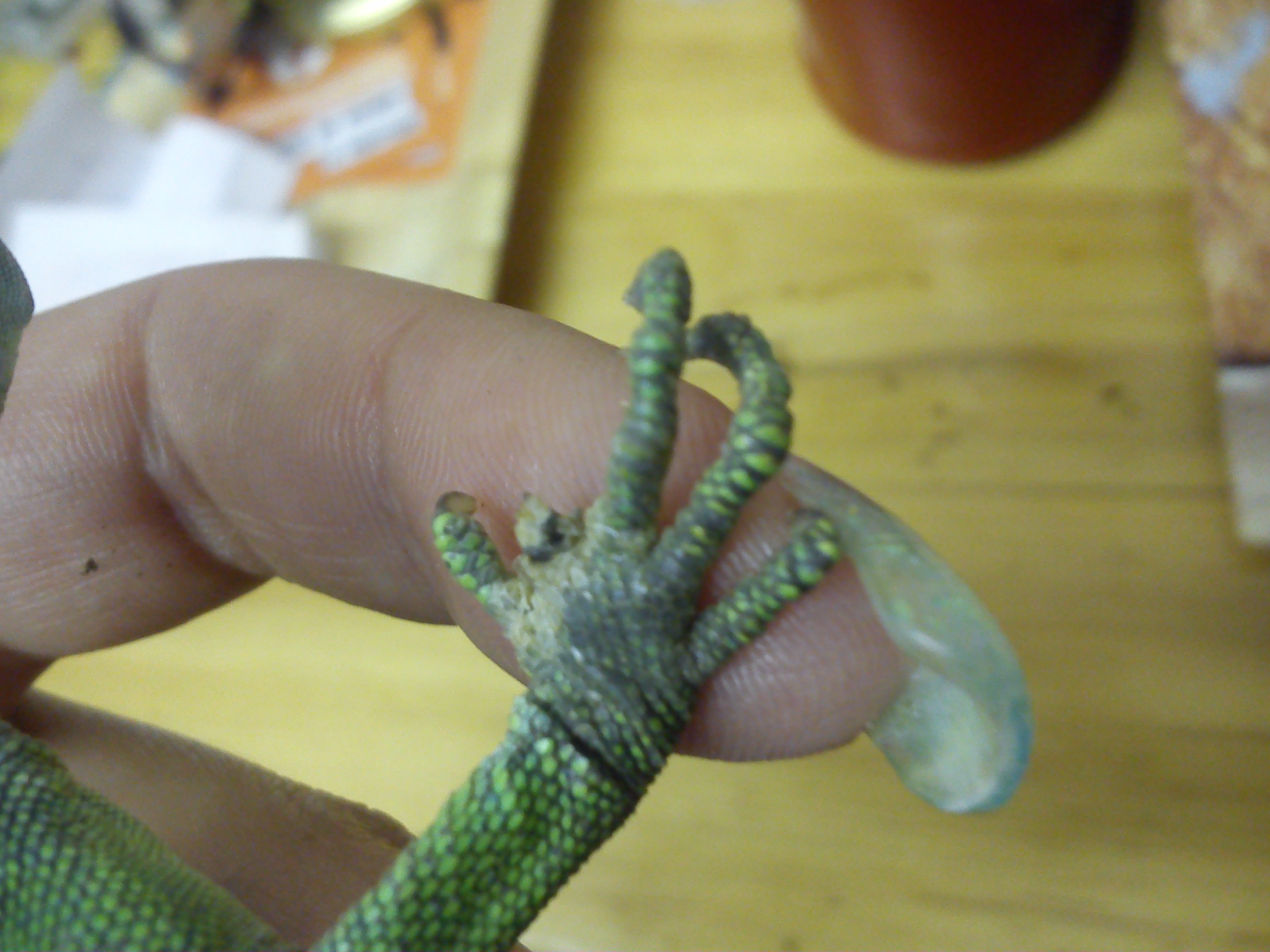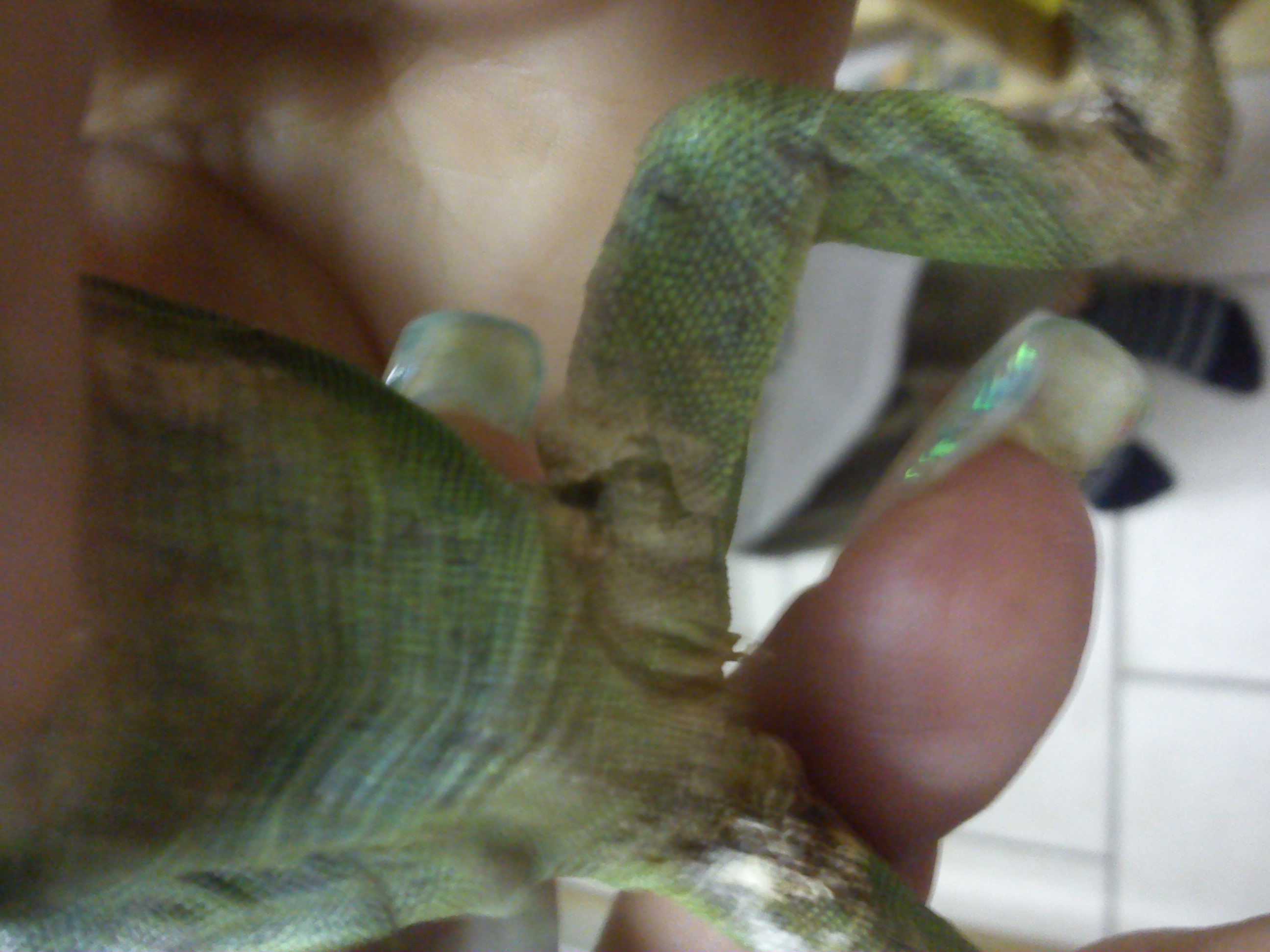 Možná se pletu, ale jako příčina může být několik nesvleků a následně zaškrcení a odumření prstů, leguánovi kontroluju, zda se prsty a nohy svlékly v pořádku, když ne, tak mu opatrně pomohu a hodně rosím.Asi bych to konzultovala s veterinářem co rozumí plazům.Já tam vidím nekrotickou tkáň, ale možná se mi to jen zdá...