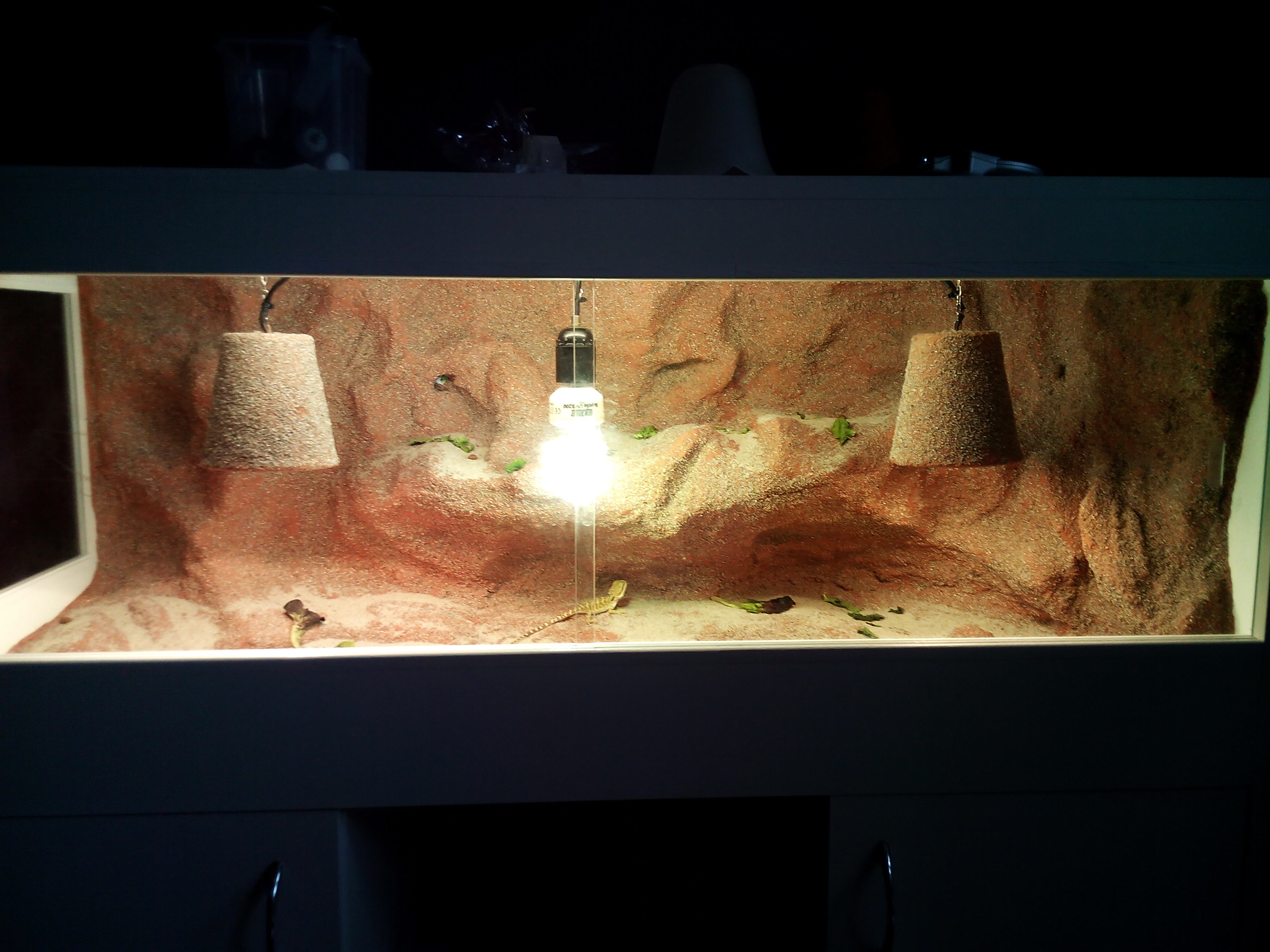 Na levé straně je obyčejná žárovka 60w pod ní je topný kámen 20x20cm , na pravé straně je žárovka UVB 200 reptile exo terra 25W. Čelní skla posuvná. Odvětrávací mřížka na stropě 100x10cm, prosklený levý bok