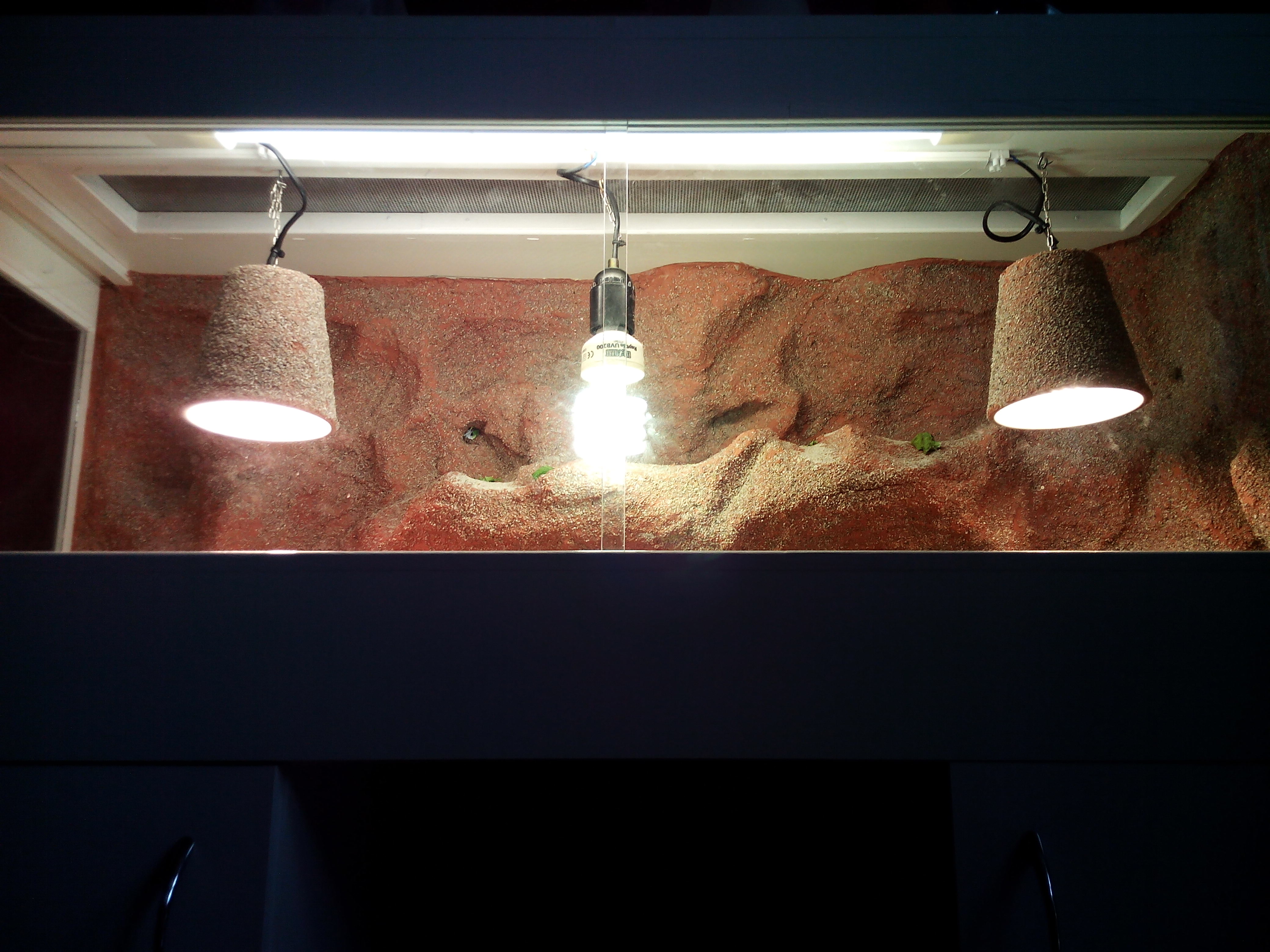 terárko jsem trochu změnil viz foto . do posledního květináče jsem dal ledku která moc nehřeje ale svítí asi za 50 žárovku .