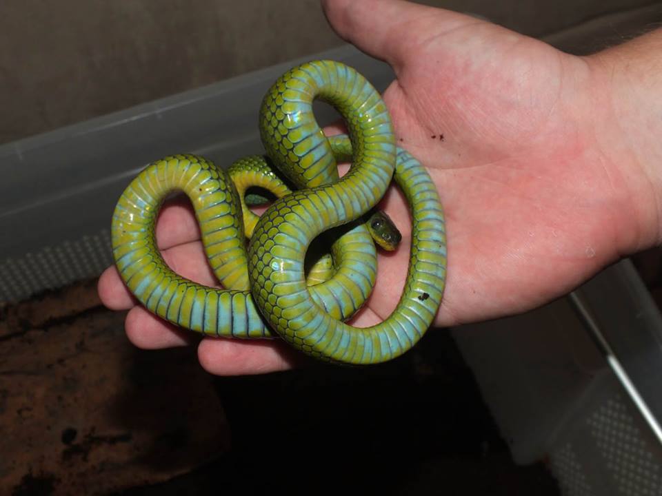 Dipsadoboje chodívají ve směsce Phylothamnusek z Kamerunu, většinou samci. Měli jsme 1 skoro celého modrého samce co nic nežral asi 3 měsíce, pak jsem mu strčila do tlamky hole a to začal po strčení do tlamky žrát sám. Po pár krmeních tímhle způsobem už si je bral sám.