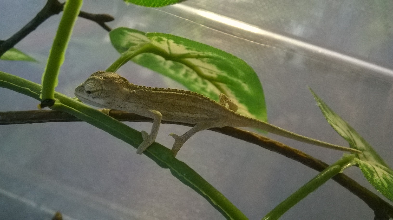No jo, původně přibyla před měsícem jen samice chameleona dvoupruhého. Koukám jak se zakulacuje a minulou sobotu v noci porodila 11 prcků. Trochu nečekaně, takže jsem jim ubikaci vyráběla ještě v noci. Jen těch informací k odchovu jsem moc nenašla, a ani tady nikdo nic. Tak uvidíme. Zatím je mám při denních teplotách 22-25 v noci pokles teploty asi na 18, UVB, baští octomilky obalované Biominem + mikrocvrčci "prach" o cokoliv většího než je velká octomilka zatím nemají zájem. Ale jsou to pěkní žrouti a rostou před očima