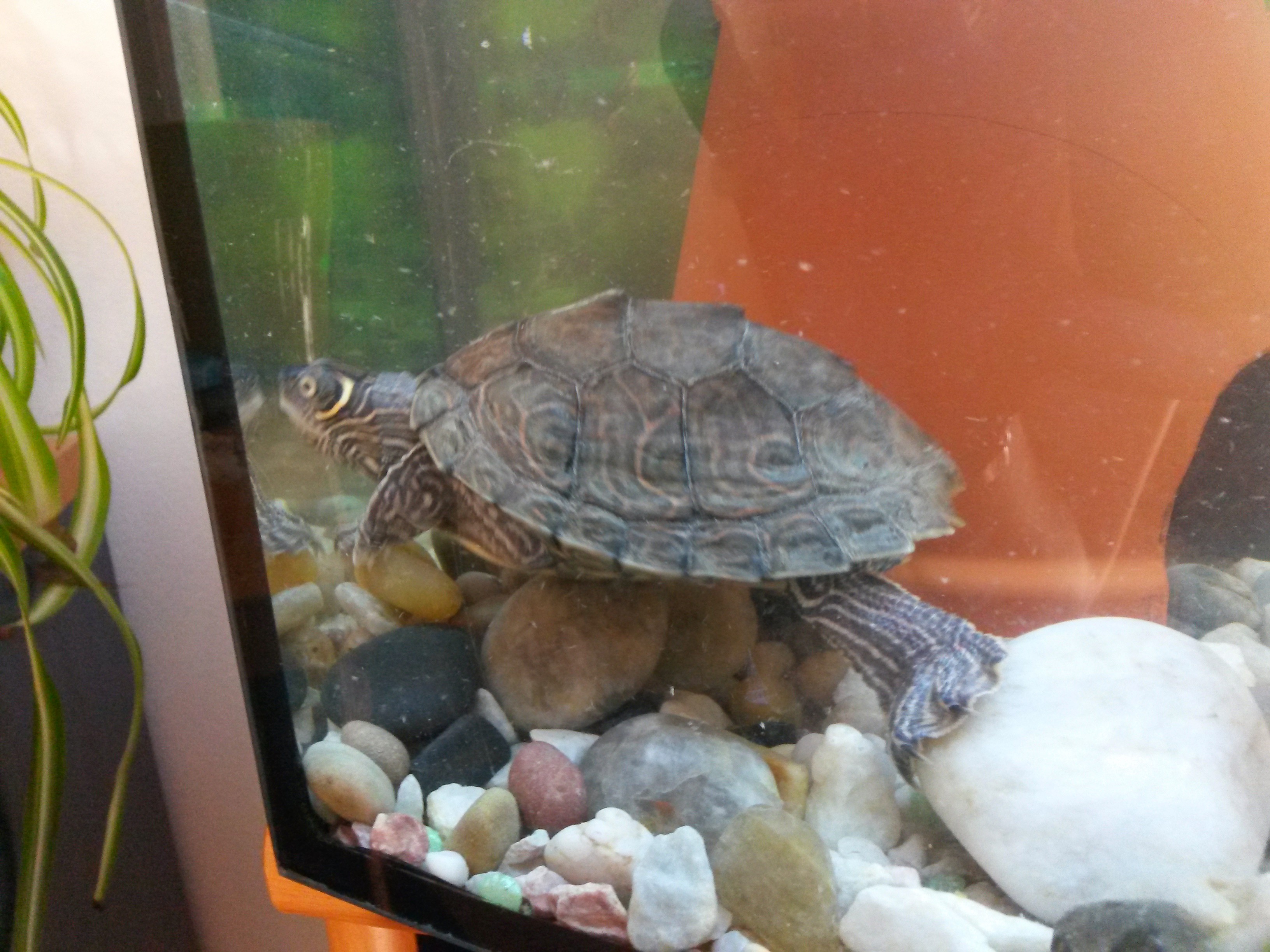 nedávno jsem tak nějak zachránil vodní želvu. Domnívám se, že je to želva malovaná samička, ale nejsem si tím stopro jistý,můžete kouknout na fotky a poradit? A taky odhadnout věk? Nic mi bohužel neřekl. Pak mám taky pocit, že je želva nespokojená, vůbec se klidně nevyhřívá a furt se snaží dostat přes to silové pole (sklo), jakože plave proti němu pryč z akvárka, ale aspoň že žere jako divá:) Teplota vody je kolem 25, pod lampičkou je něco málo přes 30, chci pořídit výkonnější žárovku, nemůžu to dát níž. Má tam filtr, zatím provizorní, to je ta zelená hadice. Akvárko má rozměry 60x25x30 (dxšxv), vody má asi 15 cm.. Přijde mi to malý, takže plánuji nějaký rozšíření. Předchozí majitel se o ní podle mě nestaral moc dobře, neměnil jí vodu, s krmením si taky nejsem nějak moc jistý, když sem jí přivezl, měla tam chudinka (je to teda samice?) mrtvého, rozkládajícího se ancistruse:( Mohl byste mi prosím poradit, co zatím můžu vylepši, aby se cítila jako doma, v klidu a bezpečí. Před tím tam nic defakto neměla, jenom jeden velkej kámen a přibližně 4 cm vody. Tak jsem jí dal aspoň květináč jako ukrýt, prý to mají rádi. Svítím UVB 10 hodin denně, krmim sušenými rybami a krevetkami nebo co to je, taky kuřecím masem, to zbožňuje, je docela dravá a zdá se mi i vitální, ale chudinka ve stresu, asi koupim i nějaký vitamíny. Myslíte, že to přejde a zabydlí se? Budu rád za jakékoliv rady a tipy, aby prosperovala a v budoucnu i přivítala parťáka