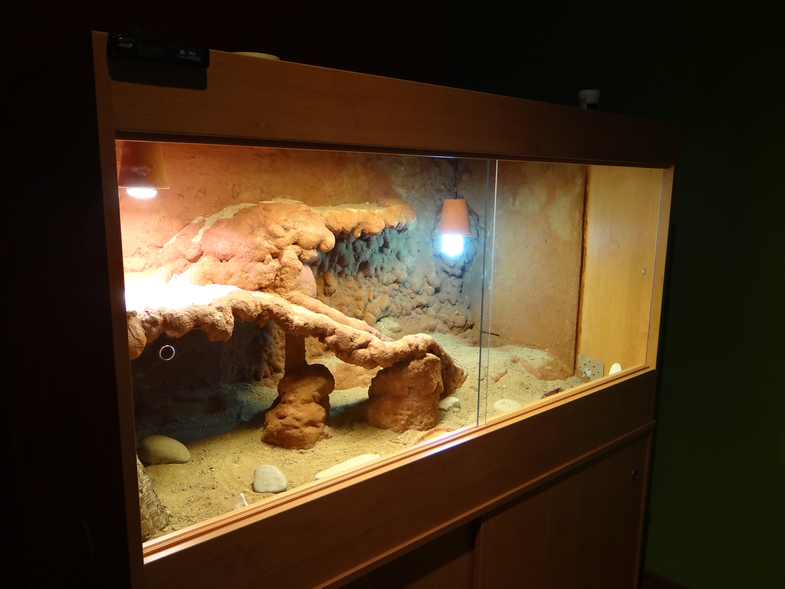 Větrání je nahoře a zabírá polovinu celého stropu a na každé straně jsou 10cm nad zemí malé otvory. Vím.. Mela by tam být nějaká sit aby tam slo vice vzduchu ale nikde jsem ji nesehnal tak jsem to udelal alespoň takto. Malo světla tam podle me neni.. Je tam jedna 60W žárovka na vyhřívání a jedna 20W zářivka na osvětlení teraria a to UVB by melo mit dosah do pul metru. A k žárovce ji uz bohužel dat nemuzu ale klidne ji mohu posunout o par cm níže.