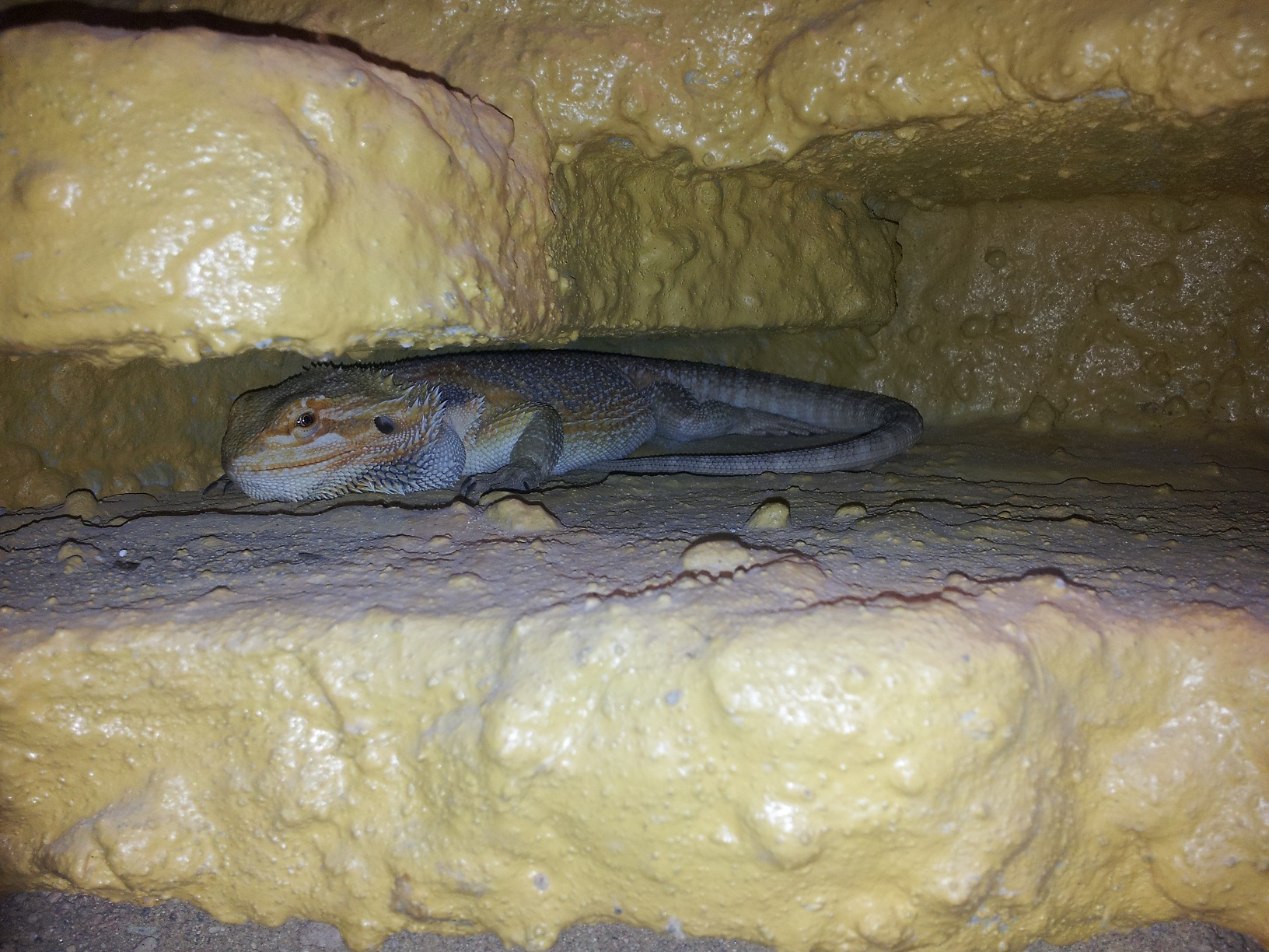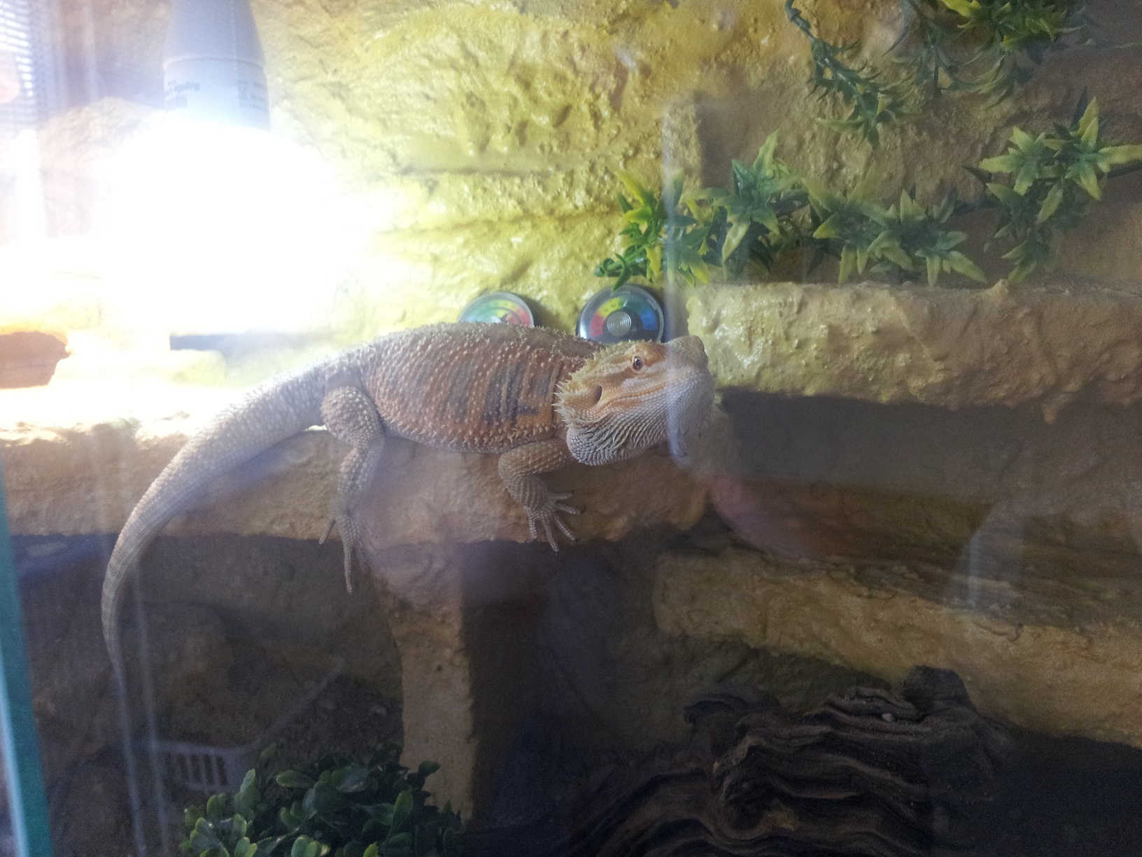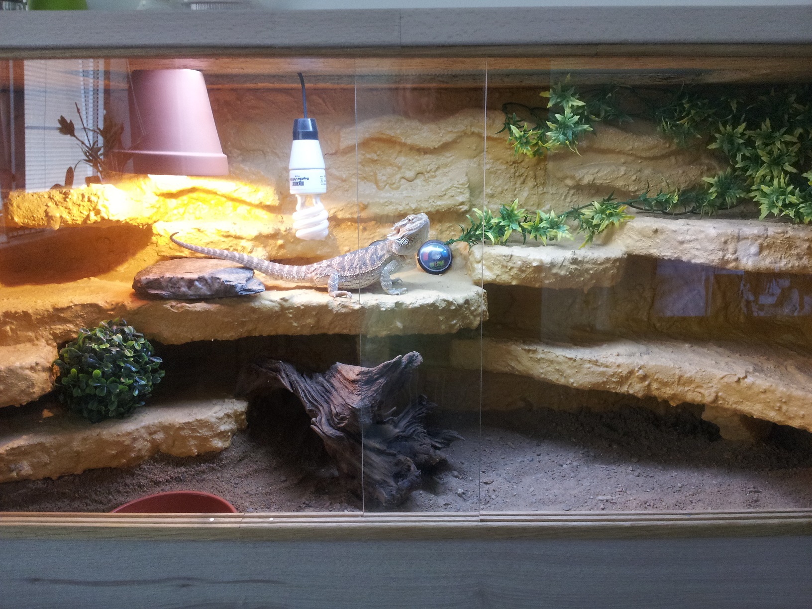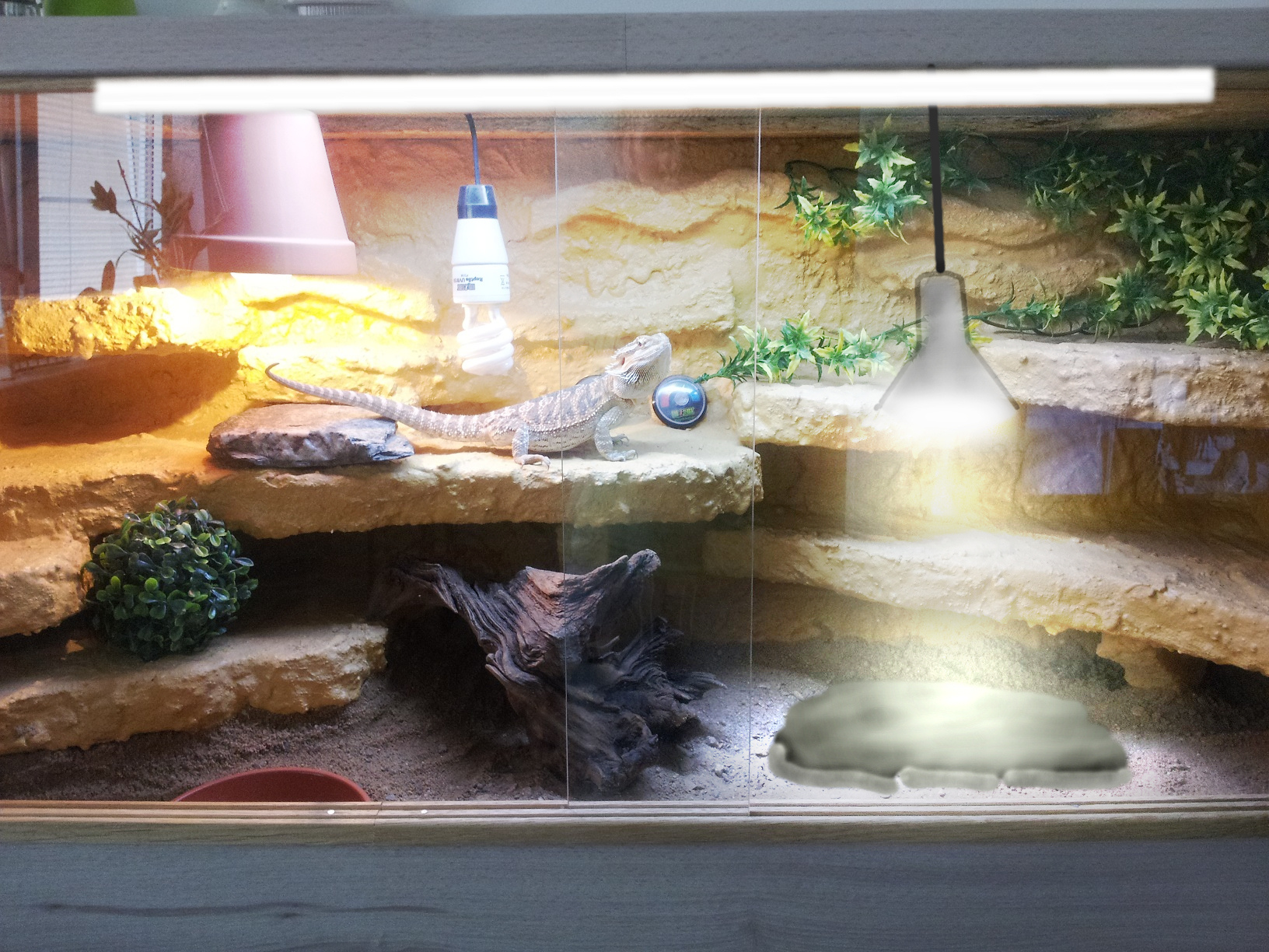 Agamka vypada dobre, v dobre kondici. Terarko mi prijde hlavne malo osvetlene - to je nejcastejsi chyba, malo svetla v prostoru. Osobne bych dal nahoru pres celou delku cim silnejsi zarivku, a vyhrevne misto + zdroj UV bych udelal dole vpravo vybojkou - cca. nejak jak bych si to prdestavoval viz priloha.