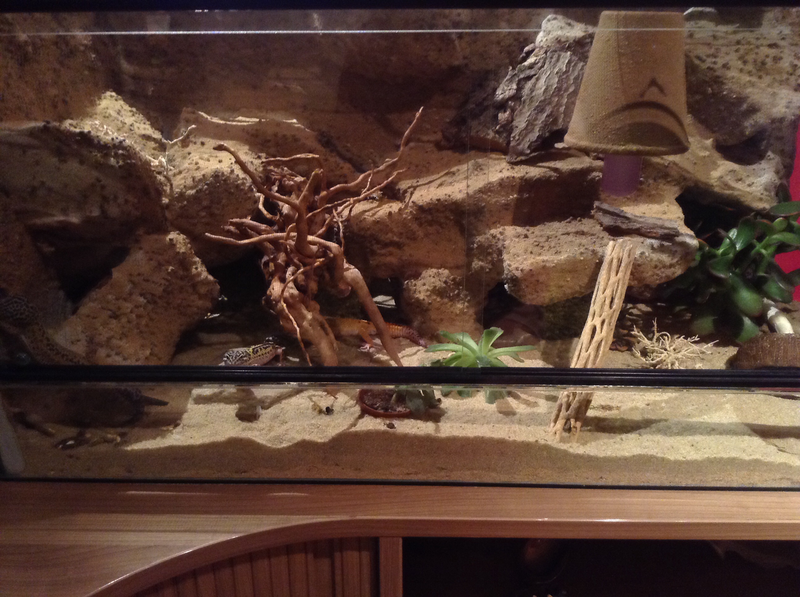 Dobrý den, píšu zase, protože se mi z terárka snaží zdrhnout i samec. Něco tedy musí být špatně nejspíš v terárku. Přikládám fotku terárka ještě popíši podmínky. Terko je velké 120x40x60cm. Mají tam topný kámen, který je zaplý nonstop, stejně tak miska s vodou ve které se i koupou. Jsou zde 3 úkryty (jeden nahoře z kůry, další dva jsou dole, ale na fotce nejsou vidět). K jídlu dostávají 5x týdně cvrčky, nebo něco když se mi povede chytit na zahradě a občas moučné červy. Rosím 1x denně na sukulenty a stěny terárka. Větrání je na celém stropě. Z terárka se většinou snaží utéct 1. samička. Hned pi zhasnutí. Vydrží to tak hodinu a potom ji vystřídá semec. Nevím co jim je. Třetí samička je úplně v pohodě. Vždy leží celá rozvalená na kemeni, zatím co se ti dva pokouší utéct. Ještě nevím proč ta jedna samička co se pořát pokouší utéct má asi už tak týden, takovou dost tmavou barvu. Zbylí dva mají krásně syté barvy.