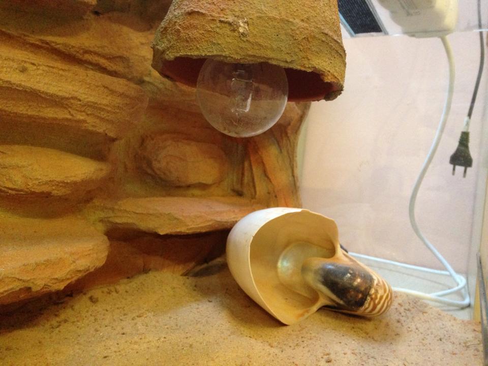 Terárko je na prd a ešte aj v ňom je blbo umiestnená žiarovka. Takto jej bude vždy bud zima, alebo sa upečie.