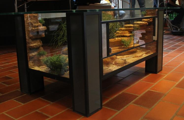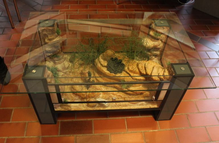 jak už tu bylo psáno- tam je potřeba hodně brát v potaz to, že běžné používání stolku bude většině zvířat působit nepřiměřený stres. Čímž se vylučují všechny plašší nebo stresovější druhy, steně tak druhy náročnější na údržbu. Na druhou stranu když se to dobře promyslí a hezky zařídí, tak třeba parta gekončíků tam bude fungovat bez problémů. Ti nejsou náchylní na stres a navíc v době, kdy je obvykle stolek nejvíce používaný jsou stejně většinou zalezlí a spí. Osvětlení se dá udělat tak, aby neoslňovalo lidi a gekončíci tam mohou mít na vyhřátí vhodně zabudované topné kameny. Projektovala jsem něco takového jedné firmě a už to funguje několik let, ta ébéčka tam jsou spokojená a dobře se v tom množí..