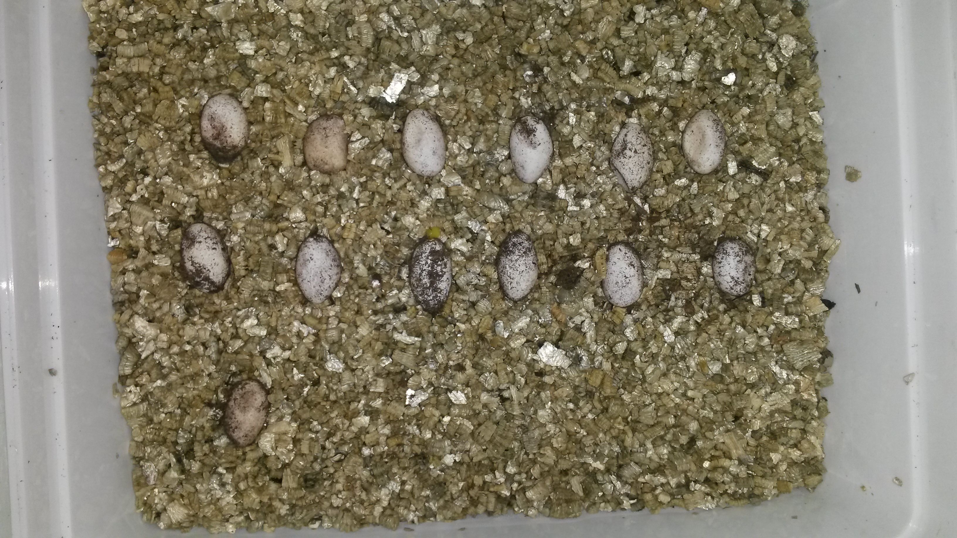 Některá vejce asi budou špatná, ale tohle je prostě moc sucho. Zvlhči víc vermikulit - tak, aby byl napitý, ale netekla z něj voda a krabku s vejci normálně zavři, na větrání stačí pár malých otvorů třeba ve víku nebo ve straně krabky. Jinak vermikulit se v průběhu inkubace dovlhčuje tak, že do rohu kápneš trochu vody. V žádném případě nerosit na vejce, tím bys je akorát zabil. A dovlhčovat pouze v případě, že ten vermikulit moc prosychá, ono to často během celé inkubace vůbec není potřeba.