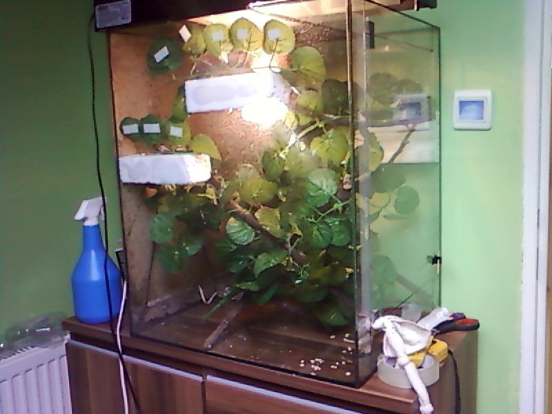 Větrání nahoře, dole bohužel neni a momentálně to řešim tak že mu buď nechám pootevřený dvířka nebo když nechcu aby vylezl tak mu tam chodim vyvětrat. Žárovky sou nahoře, jedna svítí nad mřížkou a druhá je hned vedle. UVB má vevnitř uprostřed nahoře v tom květináči jakoby dávám foto, je to v pravo to UVB. A když ve volné přírodě leze někde v zarostlim prostředí tak taky nemá úplně velký světlo ne :) ale tak pořídim teda, jenomže nevim jak to tam přidělat, to jak to mám teď bych moc rád udělal jinak ale nejsou peníze a ani možnosti. A to ještě bych chtěl pořídit větší to terárko, ale musim počkat až bude cash :( jinak ho dávám i ven slunit když je teplo.
