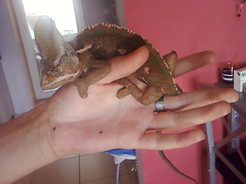 Takže dávám foto terárka a chamíka při páření s mojí rukou.