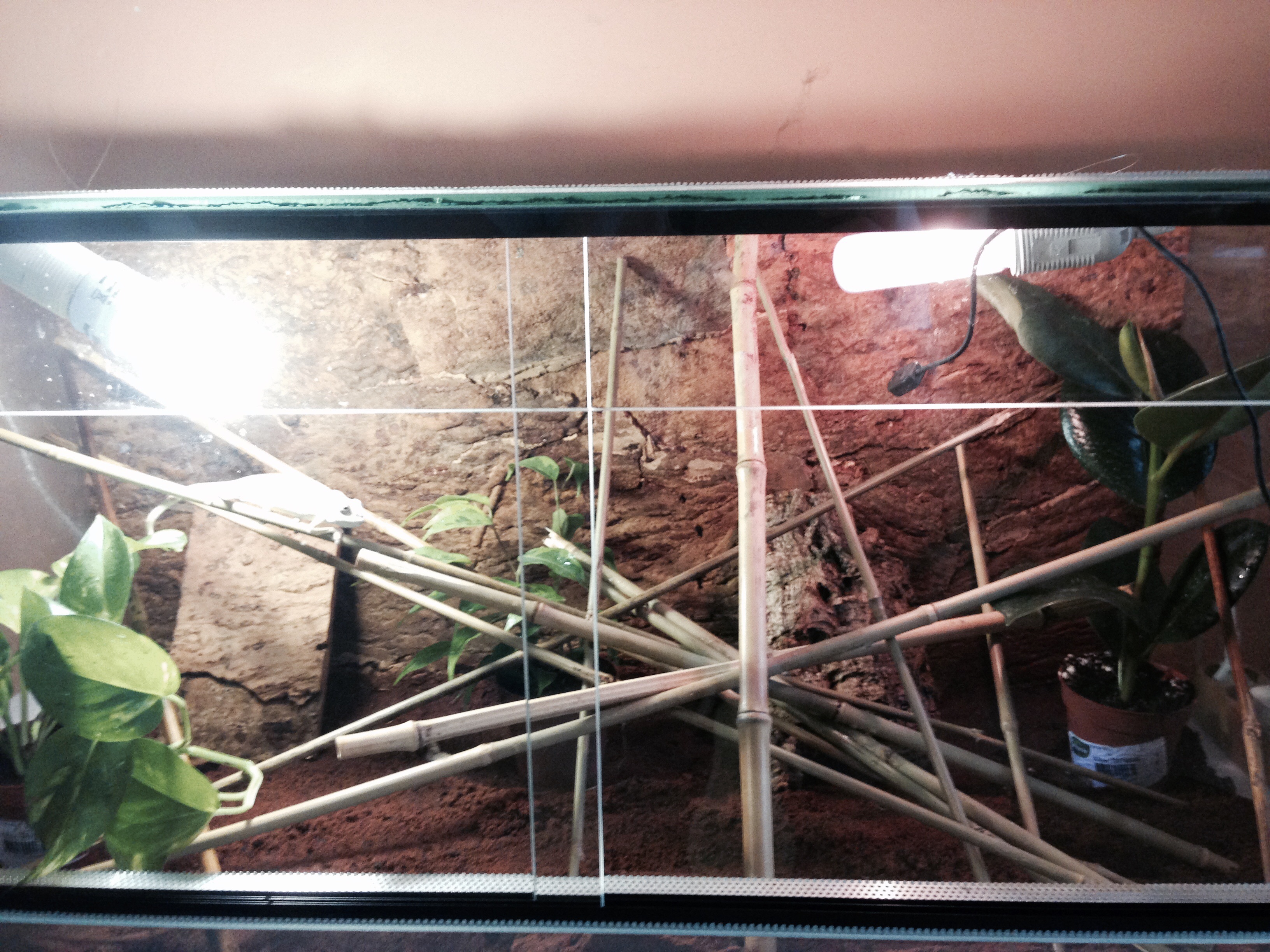 bambus vyhod.. venku smikni vetev.. hlinu vyndej a na dno dej treba kuchynsky uterky.. cvrcky se mu snaz podavat v nepuhlednej krabicce aby se nehonil po celym terarku.. mohl by pak mit nohy jako zavodni krocan.. teplotu urcite snízit.. a hlavne dat pozor at se nespalí.. a zacit budovat nove terarko..
