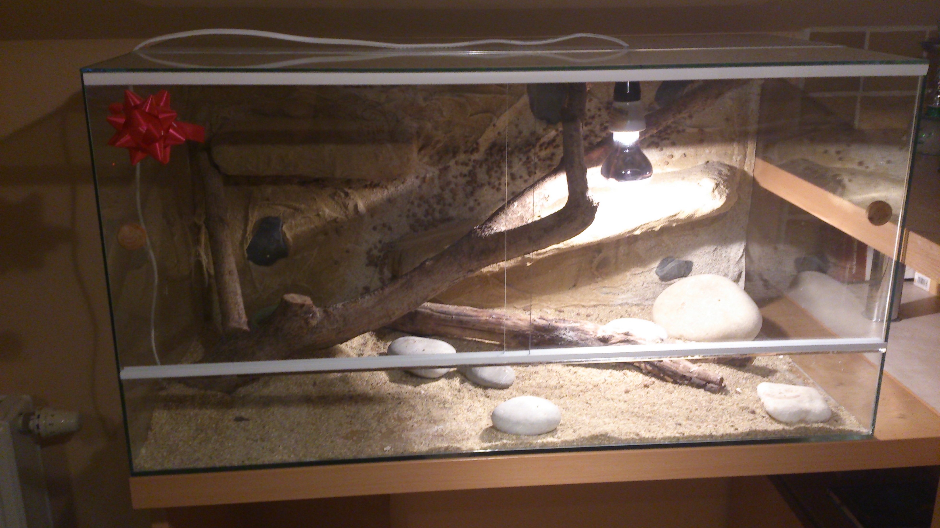 to terárko zas tak hrozné není, ale chtělo by to dosvítit lineárkou, páč tam má dost tmu. Ten lokální zdroj má i zdroj UVB? Agama nevypadá nic moc, no...od zvířete ze zverexu se to ale dá čekat, ona totiž může být i o dost starší, než tvrdili, ale "podražená". Taková zvířata pak moc nerostou ani v dobrých podmínkách a dostatku krmení. To žraní písku je většinou způsobené nedostatkem minerálií v potravě, což ale může být už od předtím z toho zverexu. Ten vápník jí dáváš jak často a co to je za přípravek?
