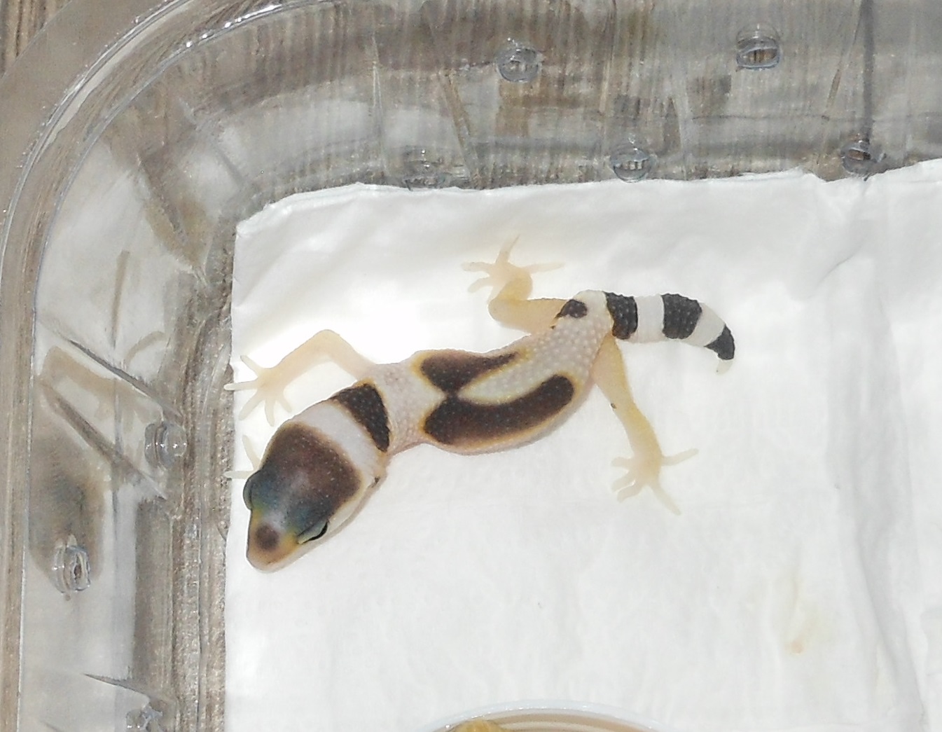 Letos se nám vylíhnul gekončík po rodičích Tremper Albino hetero Blizzard X Hypo Tangerine Jungle, ale od vylíhnutí je bílý s černými skvrnami a jen nožky má světle žluté a kolem kresby na zádech je světle žlutá linka. Chovatel jej odhadoval na Mack Snow, ale takové geny náš mazlík nemá. Budu rád za každý sdělený názor. Gekončík vylezl s kratším ocáskem už z vajíčka. Byl inkubován na samičku, vajíčko snesené 30/6 se vylíhlo 27/9 - byl to náš nejdéle očekávaný ještěr. Barva se ani po svleku nezměnila, přibyly pouze černé tečky na zádech.