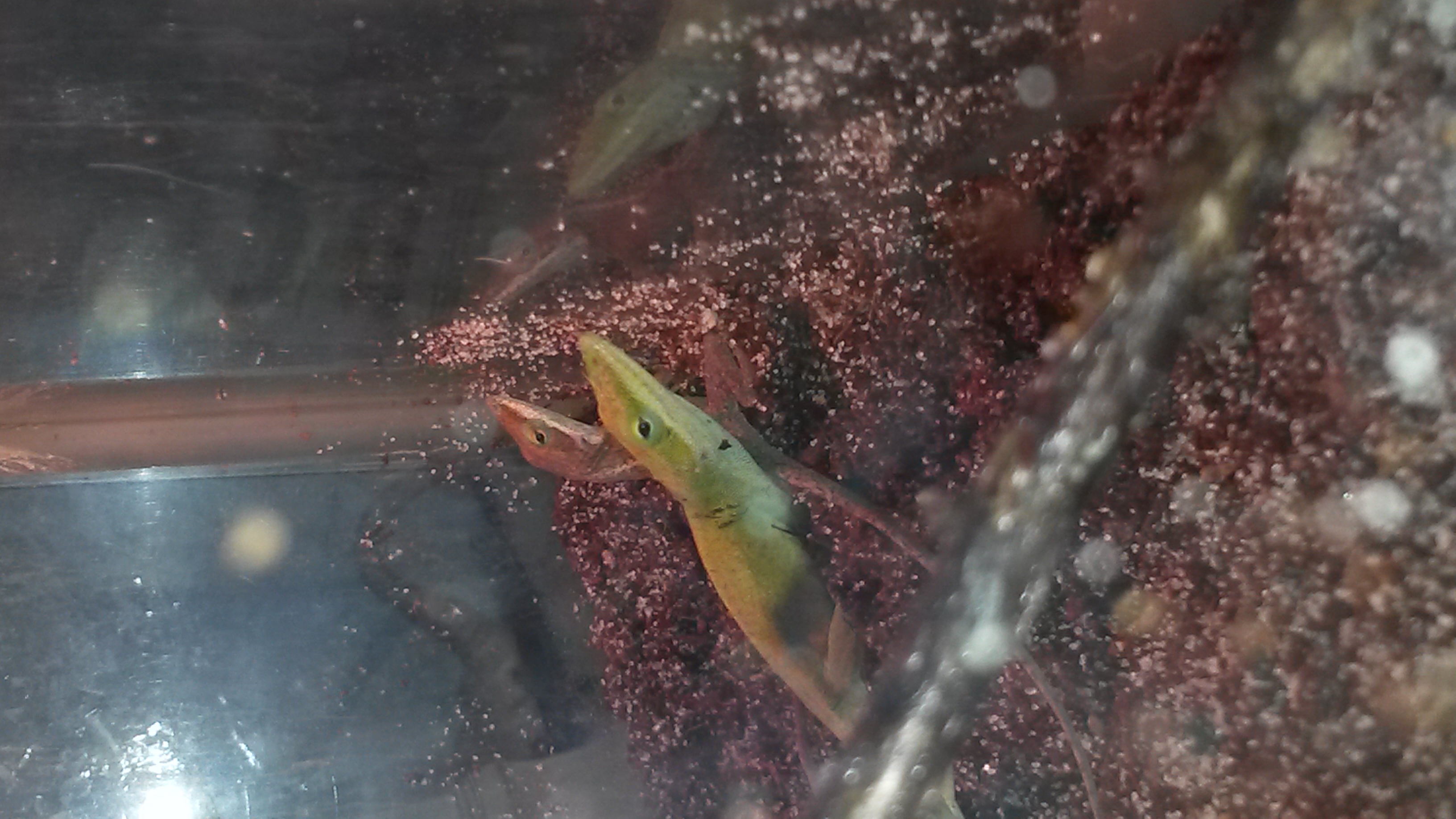 Anolis Carolinensis (Anolis Rudokrký) Vypadá to na pár, ale dle druhé fotografie to terarium nebude to pravé ořechové. Odhadem, protože toho z fotky moc vidět není, ale potřebují terarium vyšší, se spoustou horizontálně a vertikálně umístěných větví. Čím víc zarostlé tím líp, UVB podmínkou a vyšší vlhkost, hlavně navečer řádně porosit, vodu příjímají ve většině případů jen olizováním kapek z listí.