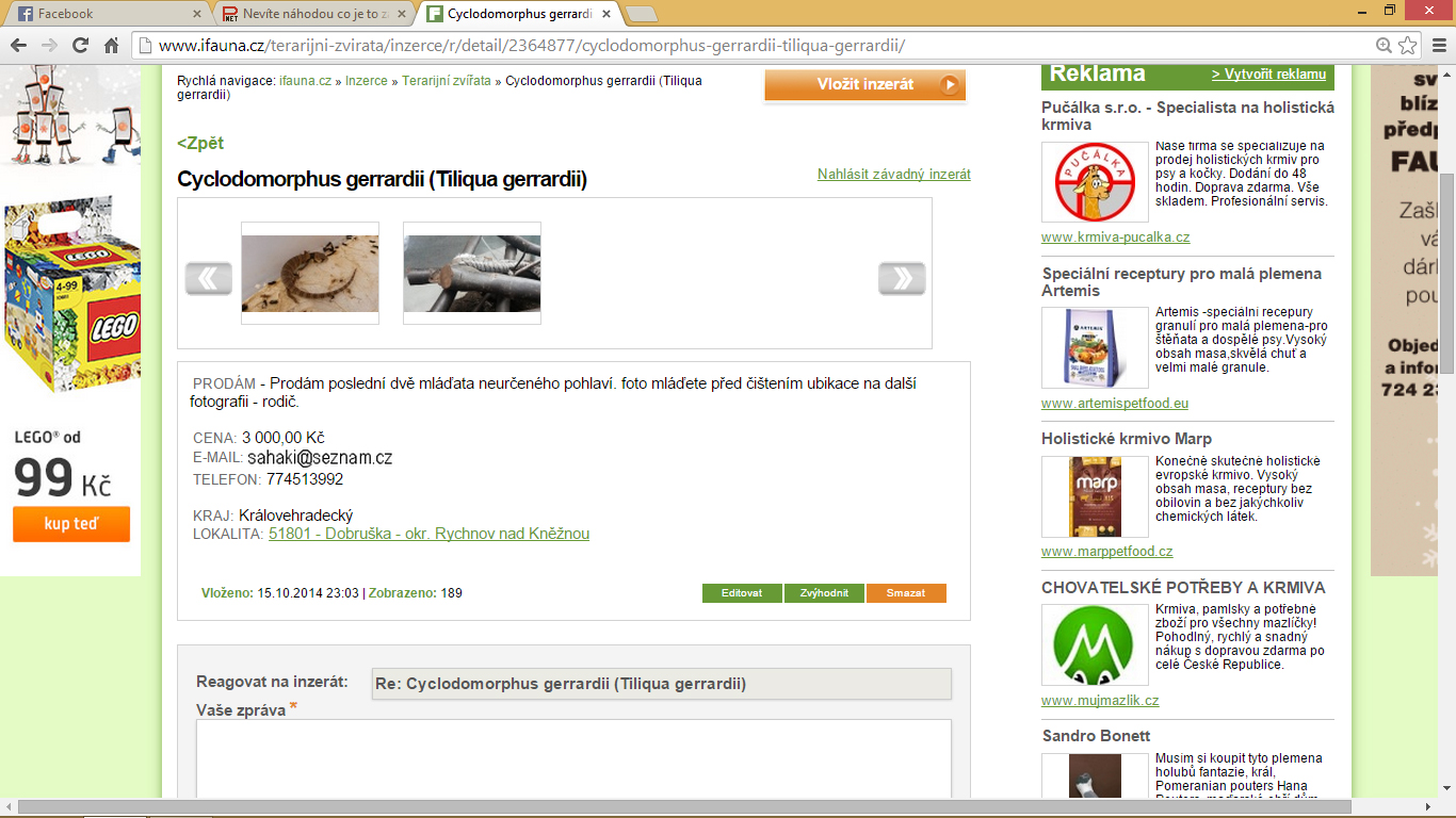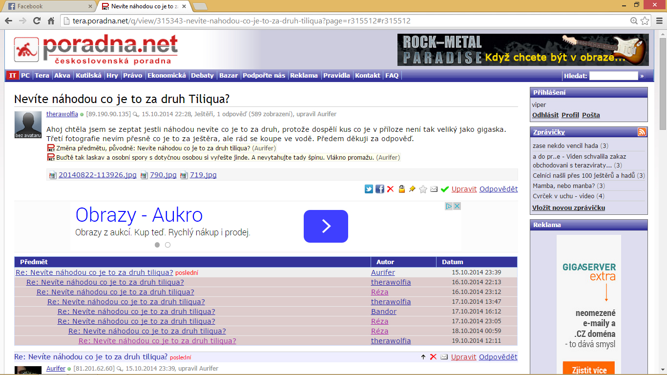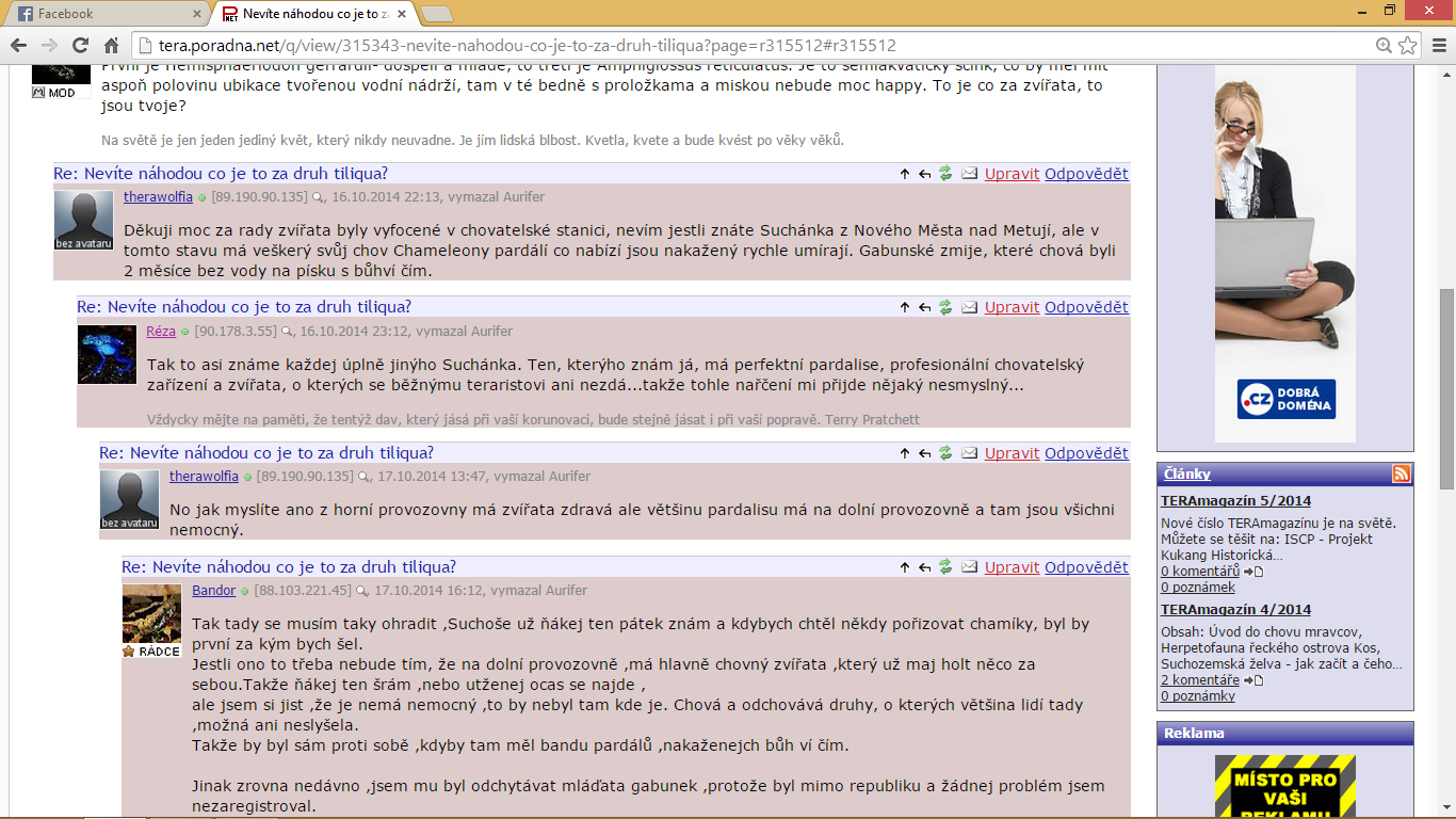 Ráda bych zde upozornila na uživatelku s přezdívkou therawolfia (Sandra Přidálková). Nedávno sem vkládala vlákno "Nevíte náhodou co je to za druh Tiliqua?", kde zmiňovala chovatele Jana Suchánka, jako někoho, kdo má nemocná zvířata ve špatném stavu a odchovy od něj rychle umírají. Tato uživatelka je ve skutečnosti bývalá Suchánkova zaměstnankyně, kterou po dvou týdnech vyhodil, když zjistil, že mu na firmě krade. Tiliquy, na jejichž druh se ve vlákně ptala, jsou jeho. Suchánkovi řekla že chcíply, nyní je nabízí na ifauně. Proto bych ráda upozornila případné zájemce, že dotyčná, co inzeruje pod emailem sahaki@seznam.cz, je zlodějka a zvířata v inzerátu jsou kradená.