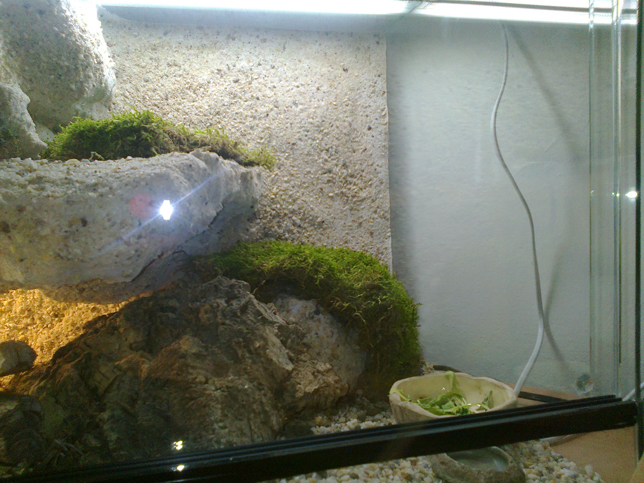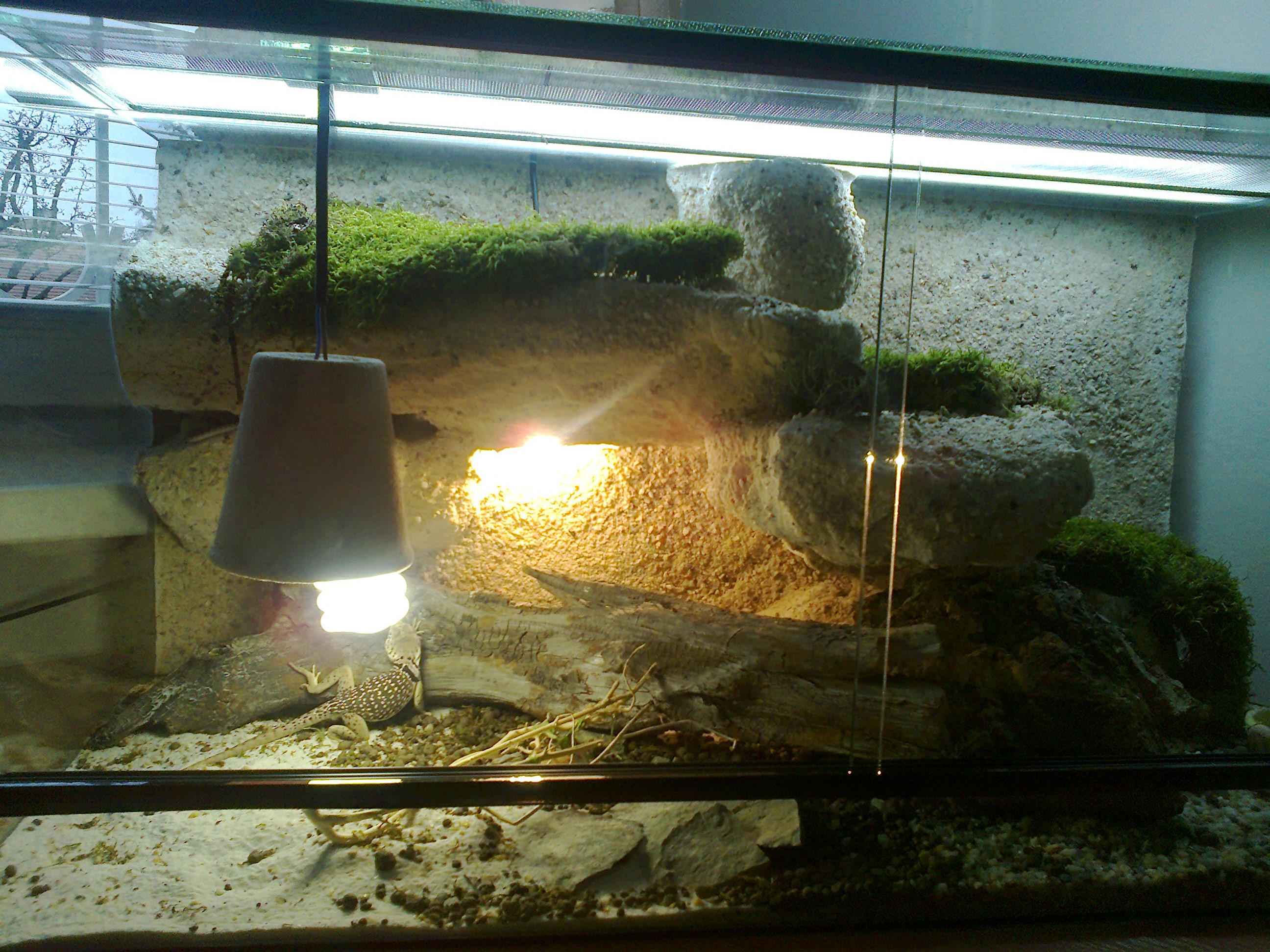 Členité pozadí, skrýš v podobě kůry (kde přes noc hraboší a spinká samička), kmen na kterém se vyhřívají, miska se zeleným a druhá s vodou, na dně terária z půlky písek a z půlky drobný štěrk, Zářivka pro dosvětlení, UVB, a obyčejná žárovka pro výhřev. Terárium takto bylo koupeno od odborníka (tedy bez světel pouze s výhřevnou).
