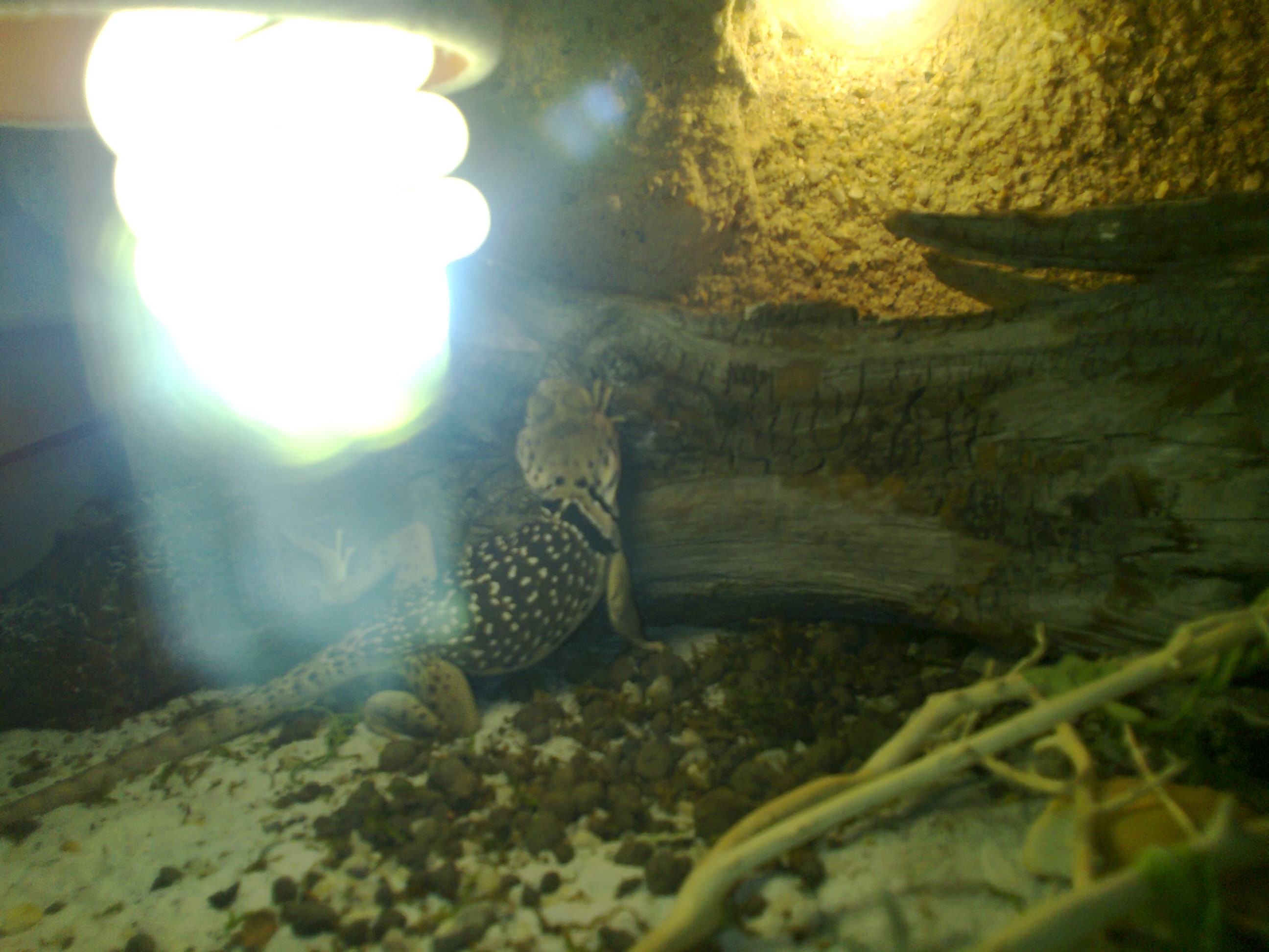 Do teď jsem čekala jestli vše není o přesunu do nového terária, ale stav samce mě znepokojuje. Od té doby co jsme je přinesli domů téměř nic nespořádal. Včera odpoledne měl svůj rekord kdy mi snědl 2 větší a 2 menší cvrčky. Předevčírem si vzal 1 cvrčka a den předtím 2 cvrčky. Začal viditelně hubnout a to mě trápí. Většinu dne polehává na svém oblíbeném místě ve štěrbině v pozadí během dne se de obvykle projít, pohrabat se v písku, poležet nahoře na pozadí kde je nižší teplota a občas si rád pospí na žárovce. O potravu nejeví zájem, ani když těsně před ním leze. Působí apaticky, ale reaguje na mě, na samici a i na cvrčky (bohužel ne lovem ale pouze pozorováním).