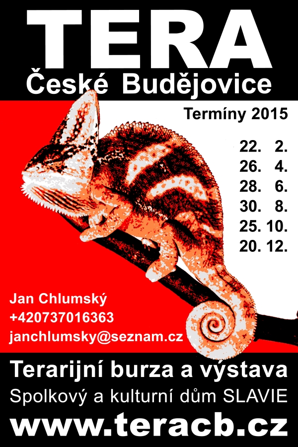 Letošní poslední terarijní burza v Českých Budějovicích proběhne v neděli 21. 12. od 9:00 do 12:00 (pro vystavovatele 7:30 - 13:00), tradičně ve Spolkovém a kulturním domě SLAVIE. Podrobné informace získáte na adrese www.teracb.cz. Pokud nám do toho něco nevleze, bude zase něco malého na zub pro vystavovatele a pro všechny máme nové kalendáříky pro rok 2015 s naprdnutým chameleónem.