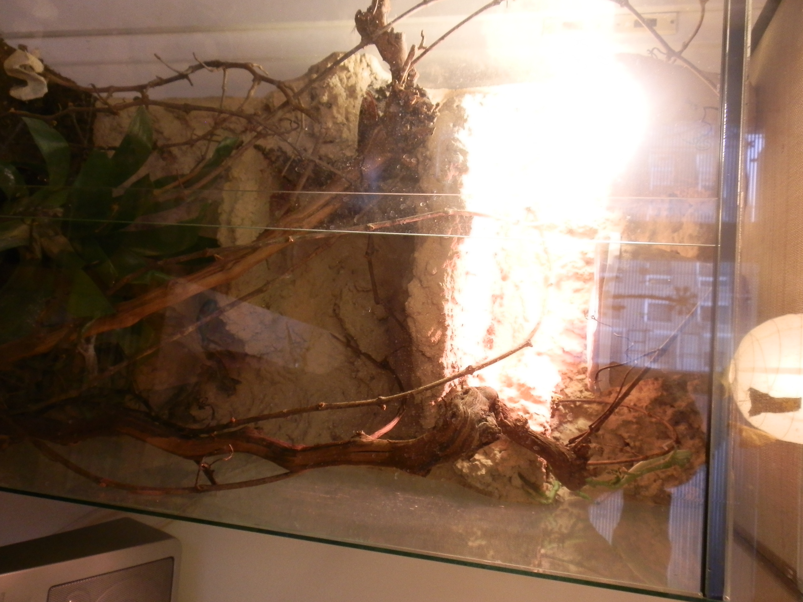 V teráriu má dvě živé rostliny.Taky tam má dvě silné větve a hromadu slabých větviček vinné révy po kterých si rád leze.