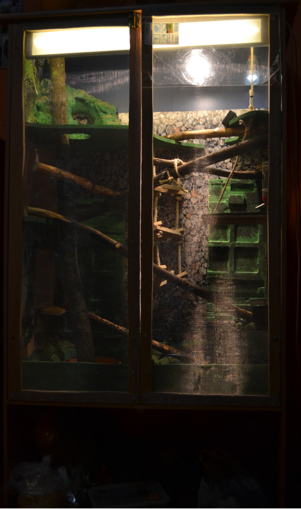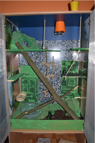 za týden bych rád koupil leguána zeleného a pro tento účel jsem postavil terárium (vxšxh ; 150,100;60), terárium je od země odsazené 50cm - větrání jsou celé přední dvoudveře, na schování má dvě jeskyně, nevím, jestli ta dole je vidět) - přemýšlím, jestli přidat více větví pro šplhání...