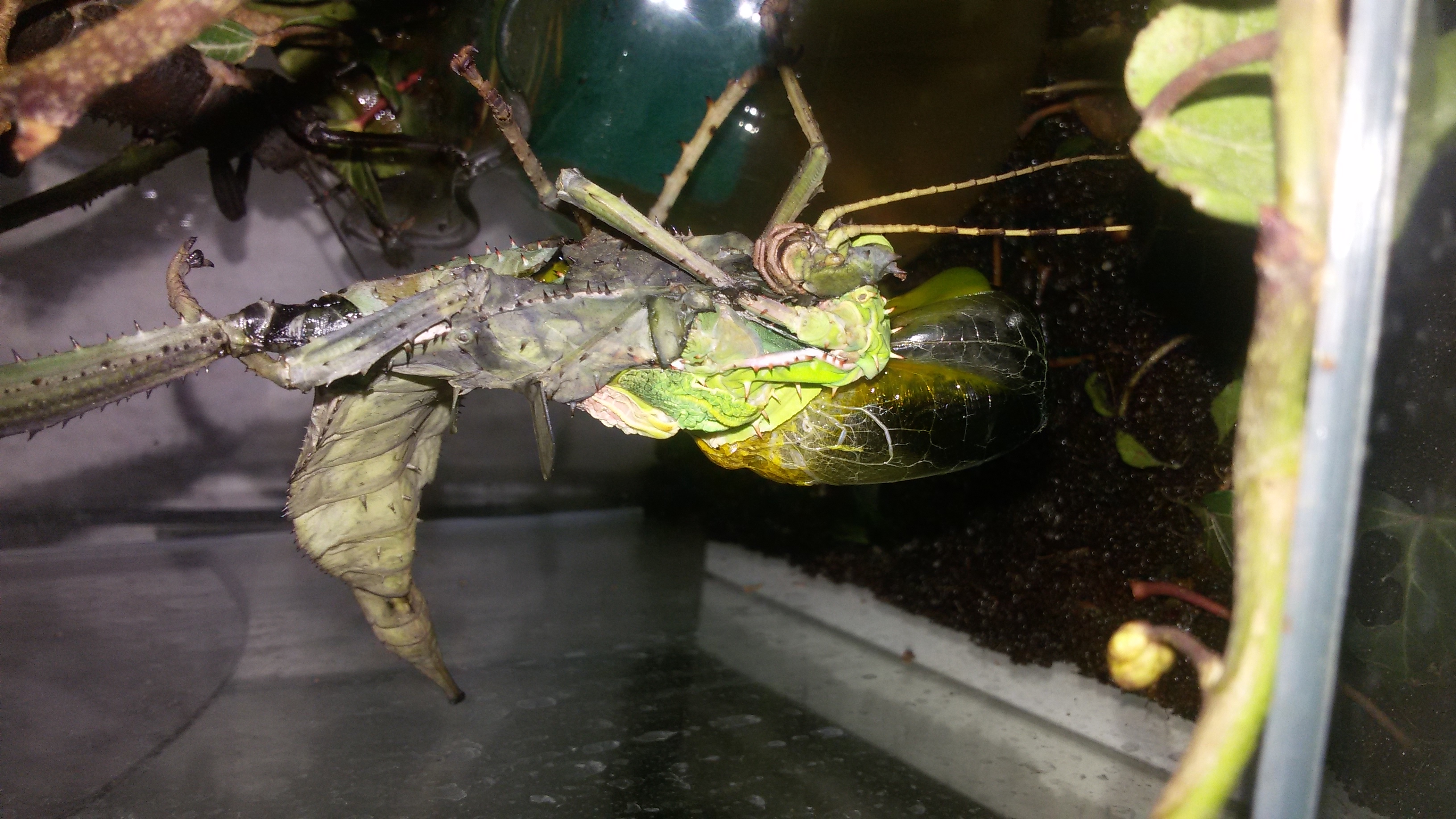 Dobrý den.Chovám pakobylky indicke jako krmný hmyz.Teď jsem si ale na okrasu pořídila pakobylku heteropteryx dilatata a eurycantha calcarata...První zmiňována se pověsila za nohu myslela jsem že se svléká ale visí tam už dva dny a navíc zni trčí vaček naplněn tmavou tekutinou...přikládám foto. ...myslím si že umírá...nevíte jestli je to normální popřípadě co se ji mohlo stát když ostatní pakobylky jsou v pohodě? Předem děkuji za odpovědi.