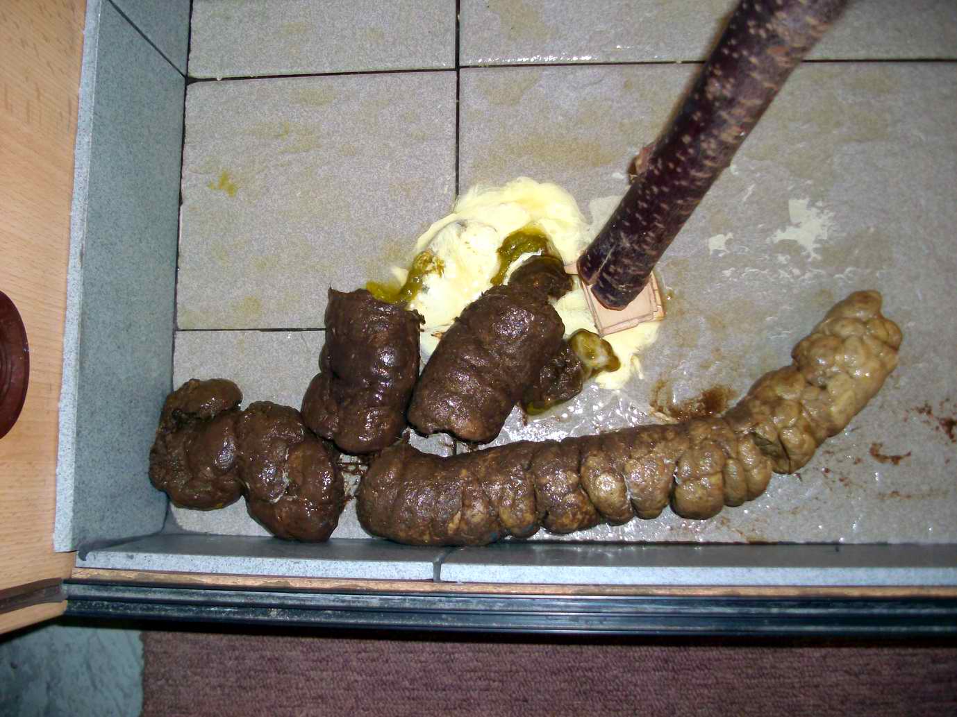 První případ se stal při krmení cca 3m dlouhé samice PMB živým potkanem. Špatně ho chytla a zvíře jí v obraně vykouslo sval z tlamy. Od té doby krmíme mrtvým. Toto je událost cca 4 roky nazpět.
