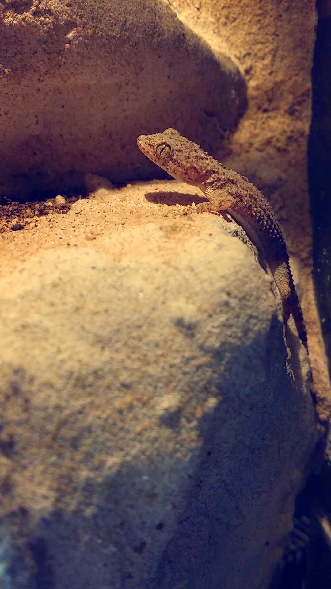 Dobrý den, asi před 4 měsíci jsem si koupila pár malých pouštních gekonů. Myslela jsem, že to jsou zední, ale pak jsem si doma všimla že mají jiný tvar chodidel. Mají normálně drápky. Jsou malincí (cca 7-8cm) a jsou docela drobní. Také mají takové malé ostny u ocásků, vůbec celá jejich kůže vupadá jak od malých krokodýlů. Doteď jsem jméno neřešila, protože se jim dařilo bez problémů. Rozhodla jsem se je ale prodat nebo darovat. Protože mám zvířata spíše na koukání a já mám v terárku v pozadí spoustu jeskyněk, takže tam jsou zhruba 22h denně zalezlí. Vidim je jen tak jednou týdně a to z dálky aspoň 1 metru od terárka, jinak opět utečou do úkrytů. Kdyby bylo jinak řešené terárko, tak to půjde, ale pozadí je napevno. Přikládám foto. Tohle je jediná fotka co se mi podařila za ty 4 měsíce pořídit.